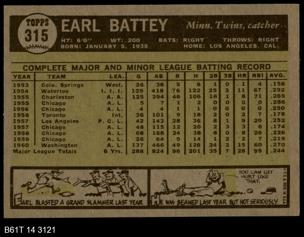 | 1961 Topps #315 Earl Battey | 5 - EX | Front | Back |