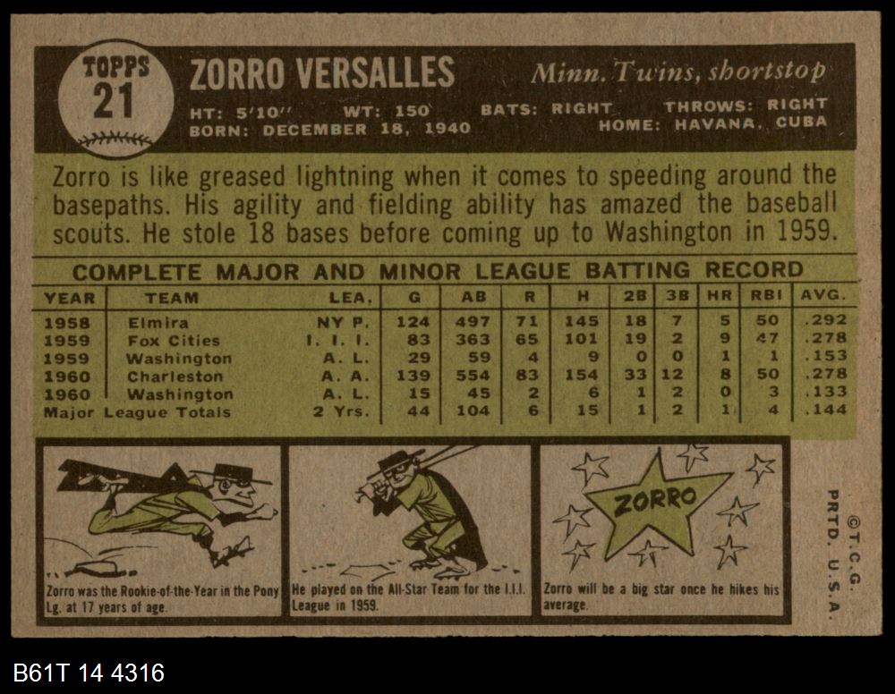 | 1961 Topps #21 Zoilo Versalles | 5 - EX | Front | Back |