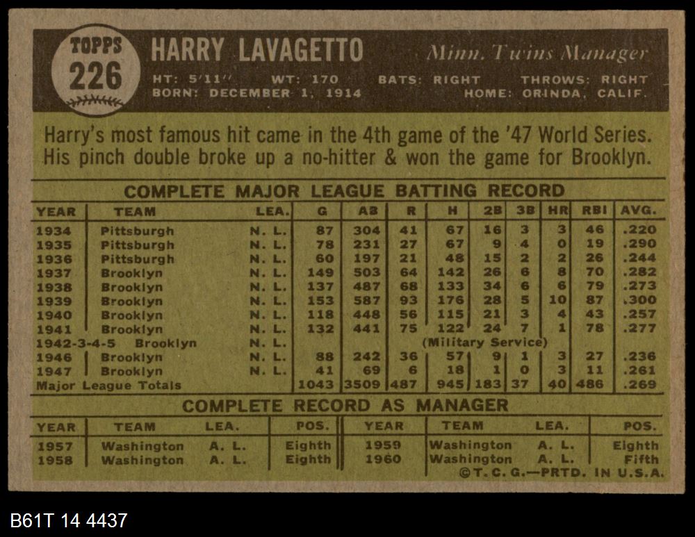| 1961 Topps #226 Harry Lavagetto | 4 - VG/EX | Front | Back |