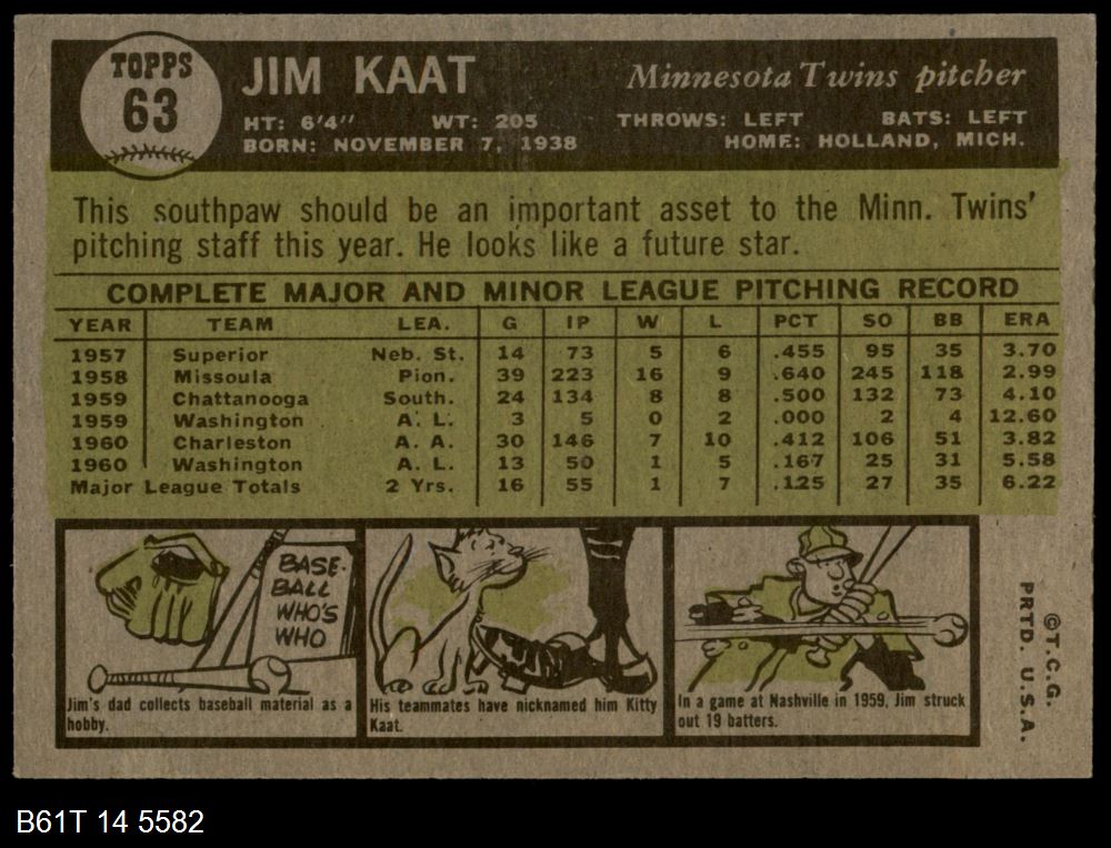 | 1961 Topps #63 Jim Kaat | 5 - EX | Front | Back |