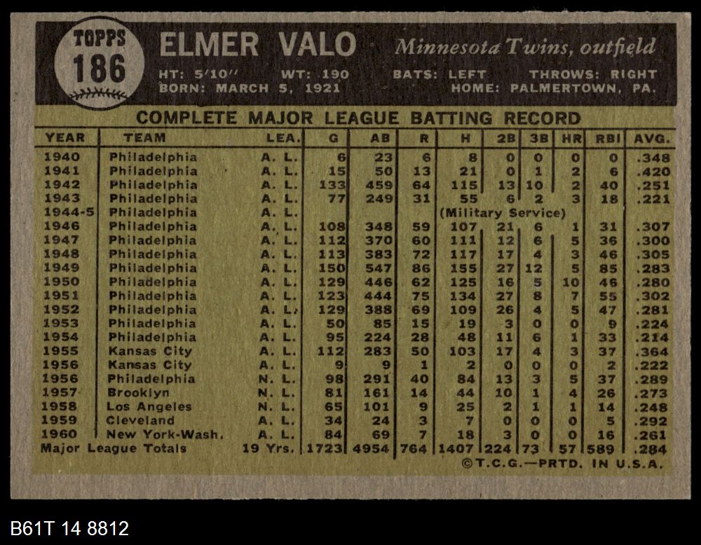 | 1961 Topps #186 May Have Border Break Elmer Valo | 5 - EX | Front | Back |