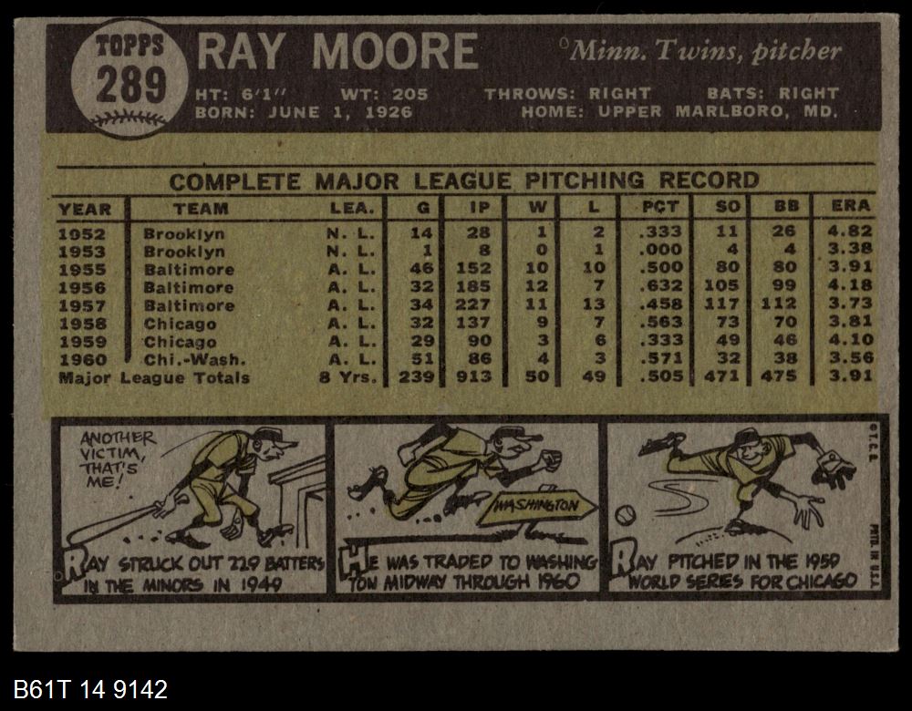 | 1961 Topps #289 Ray Moore | 4 - VG/EX | Front | Back |