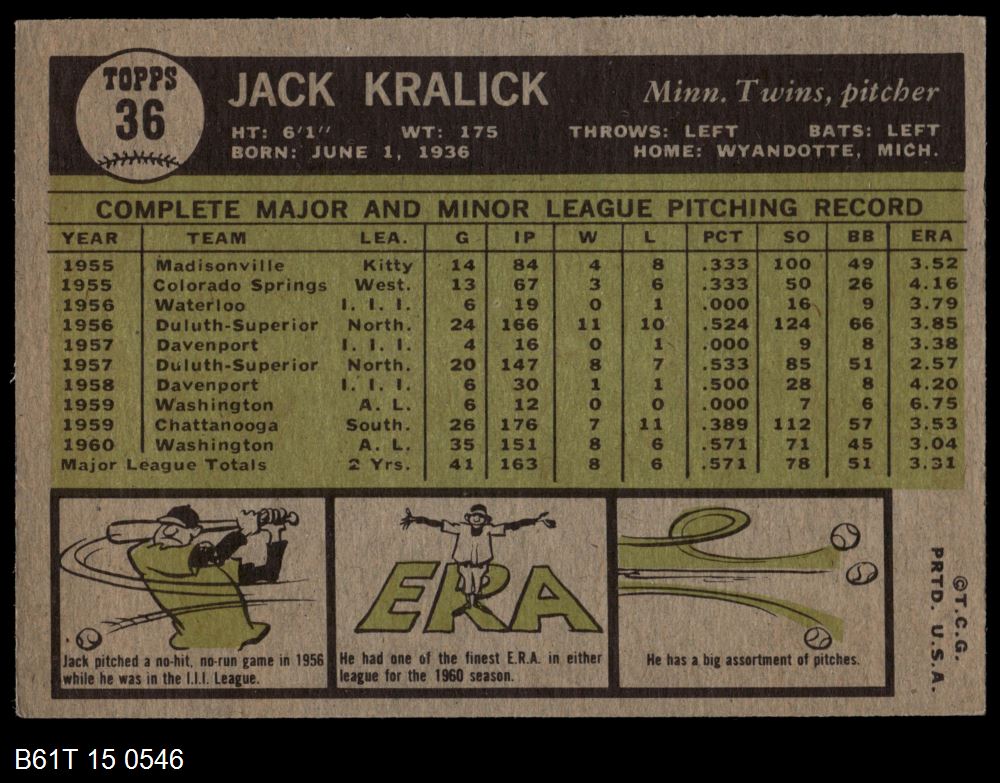| 1961 Topps #36 Jack Kralick | 5 - EX | Front | Back |