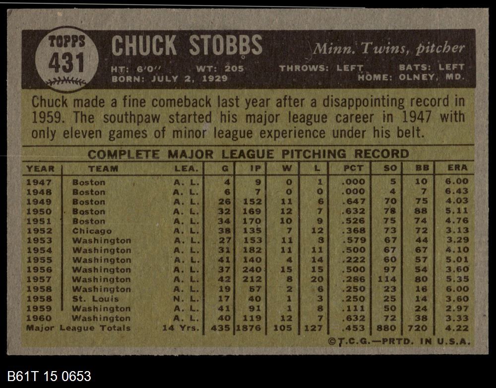 | 1961 Topps #431 Chuck Stobbs | 5 - EX | Front | Back |