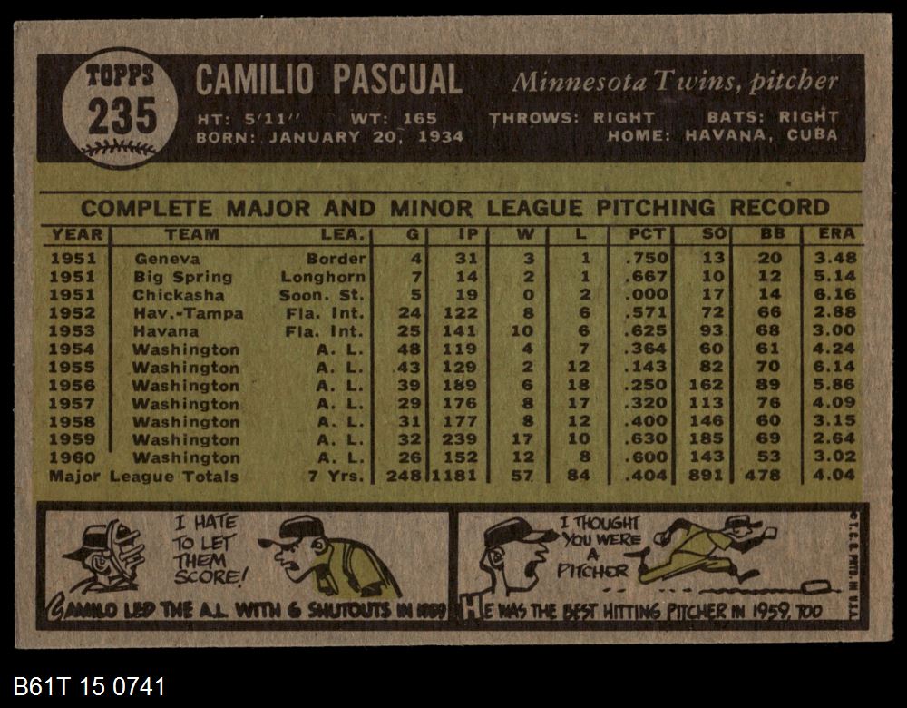 | 1961 Topps #235 Camilo Pascual | 3 - VG | Front | Back |