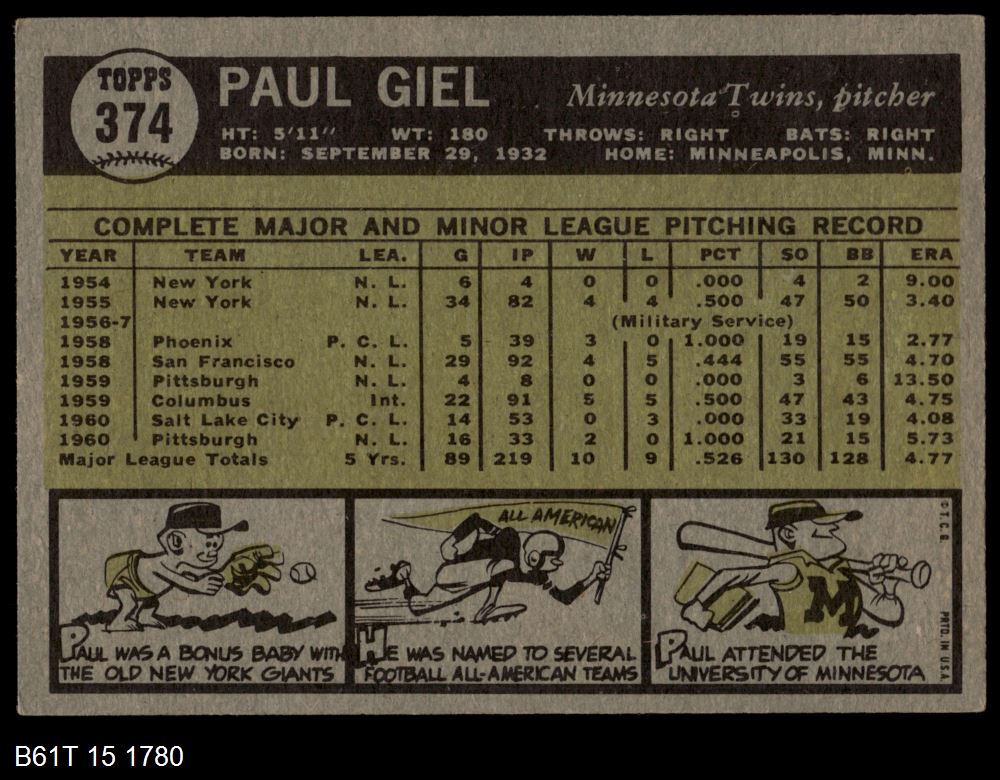 | 1961 Topps #374 Paul Giel | 4 - VG/EX | Front | Back |