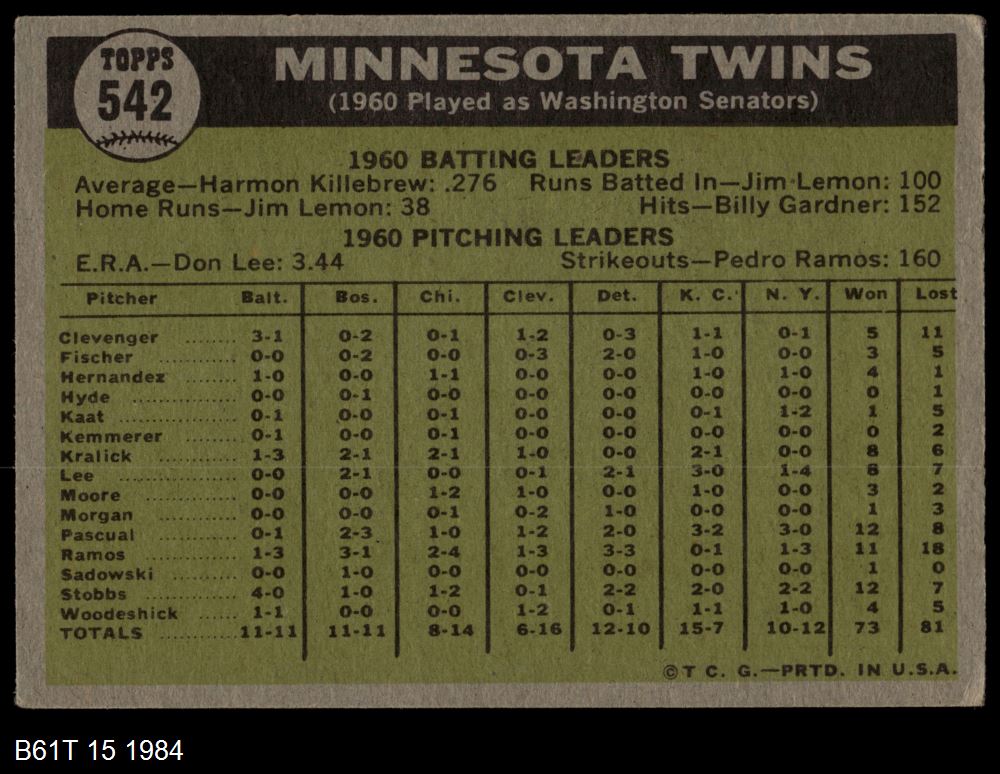 | 1961 Topps #542 Twins Team | 3 - VG | Front | Back |