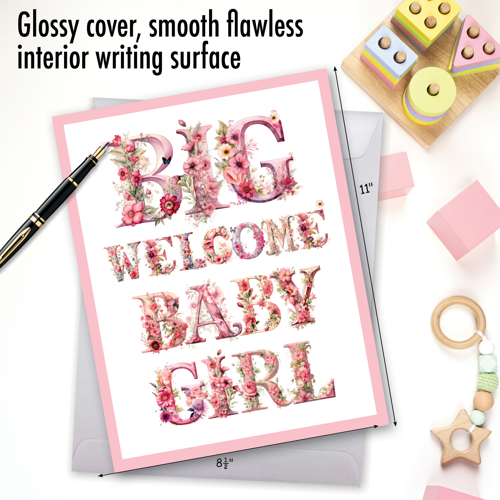 USE: stationery for writing Baby Congratulations wishes. Card's cover pages are printed on coated stock and have a gloss finish, while the cards interior pages are uncoated for a smooth and flawless writing surface for men and women.