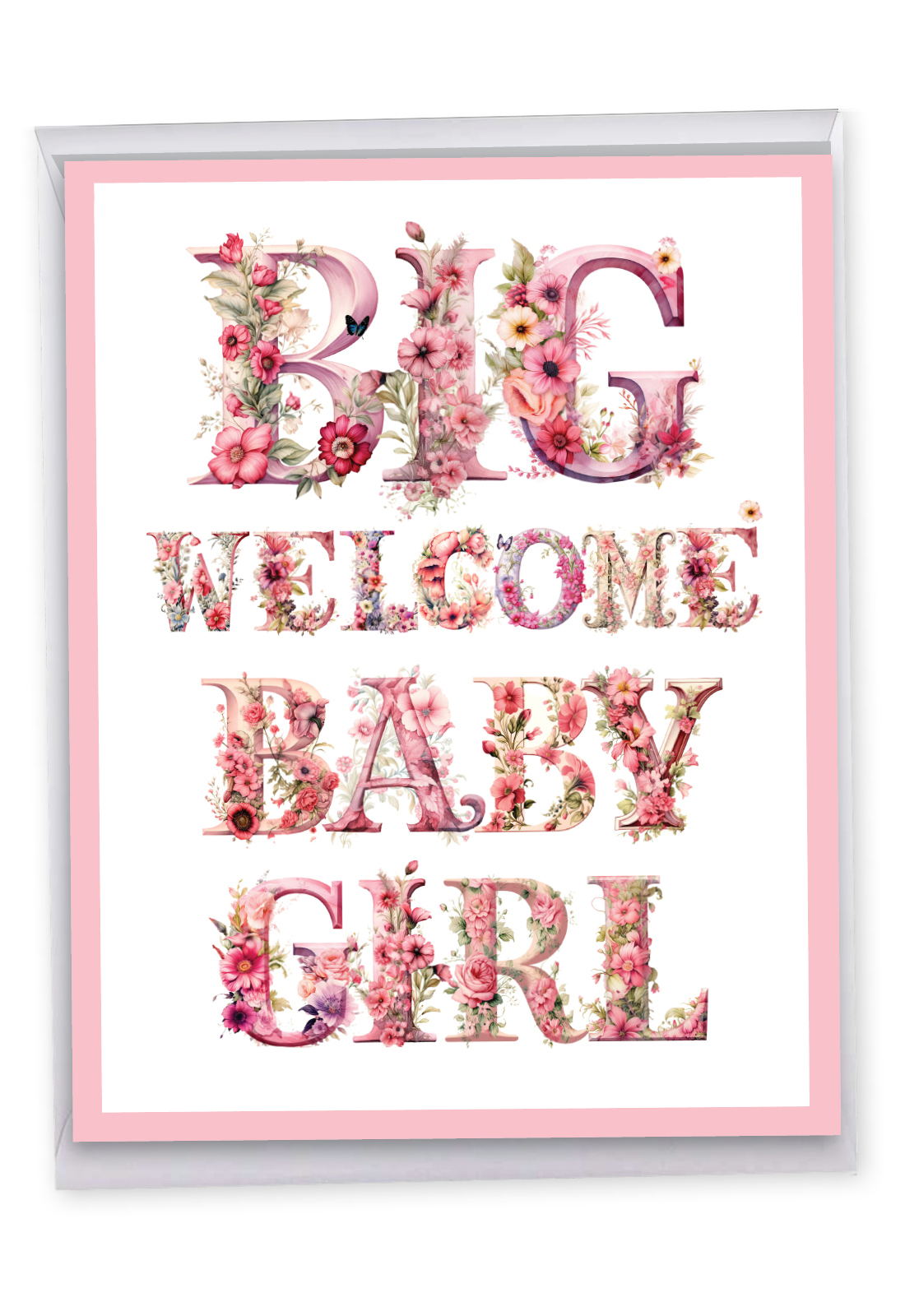 Huge and happy news! It's a girl! Epically and gloriously Congratulate those proud parents of a newborn baby female you know and love by sending them the fabulous, flower filled, supersized New Baby card on sale here. The giant goodwill congratulatory greeting features rose, bluebell, buttercup, daisy and peony entwined gigantic letters and a gorgeously garlanded border that will immensely add to enormous delight the ecstatic Mom and Dad are already feeling at the birth of their new bundle of feminine joy.