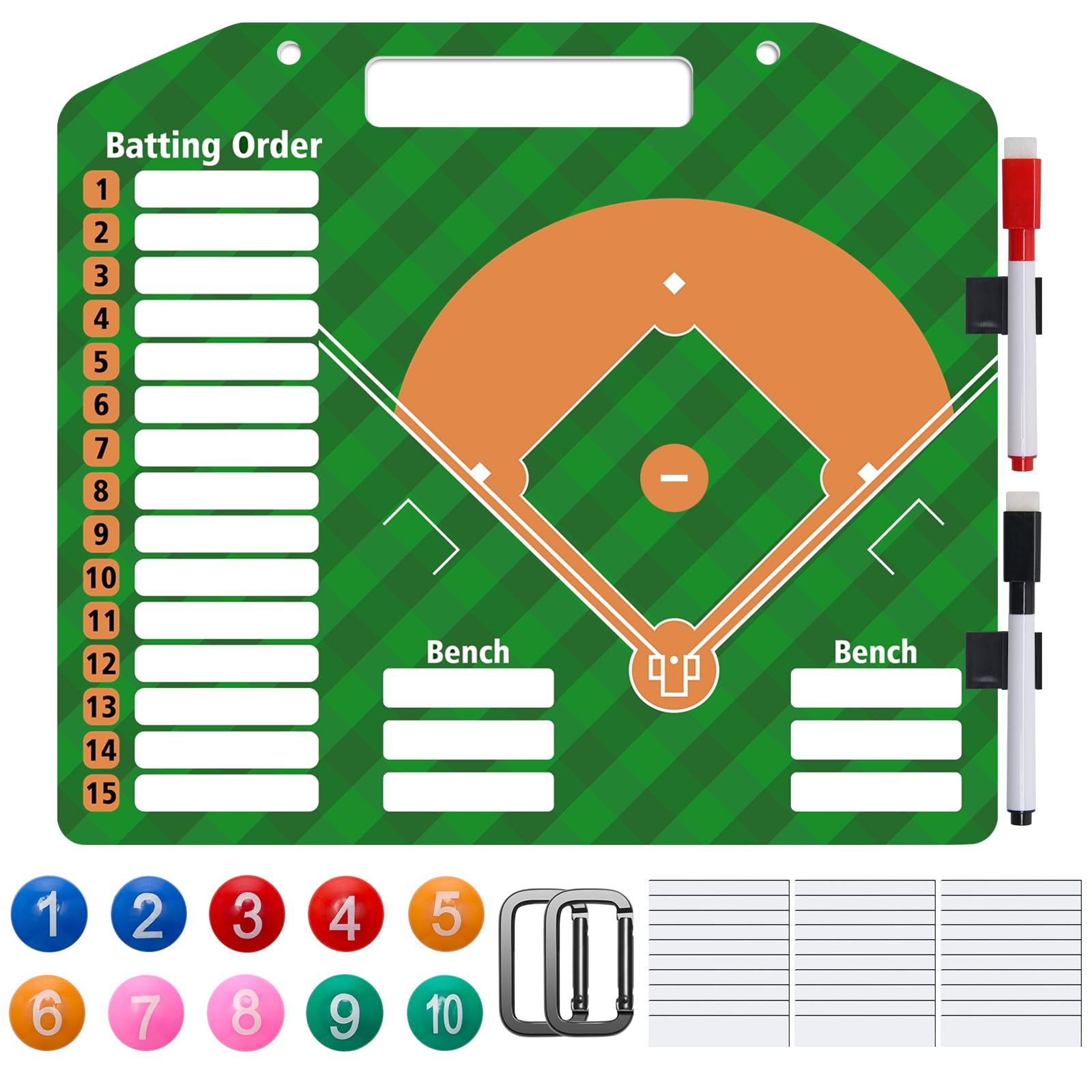 【Dry Erase】: The baseball coach lineup board is made of high-quality PVC, which easily attaches to magnetic accessories, strong, smooth surface, easily to write on and erase. Equipped with 2 buckles for easy hanging of the lineup board