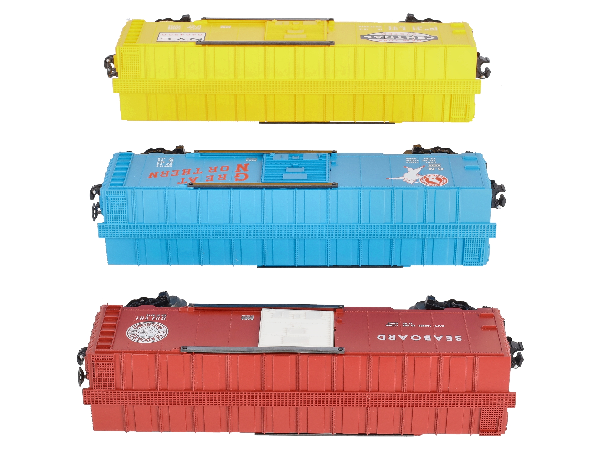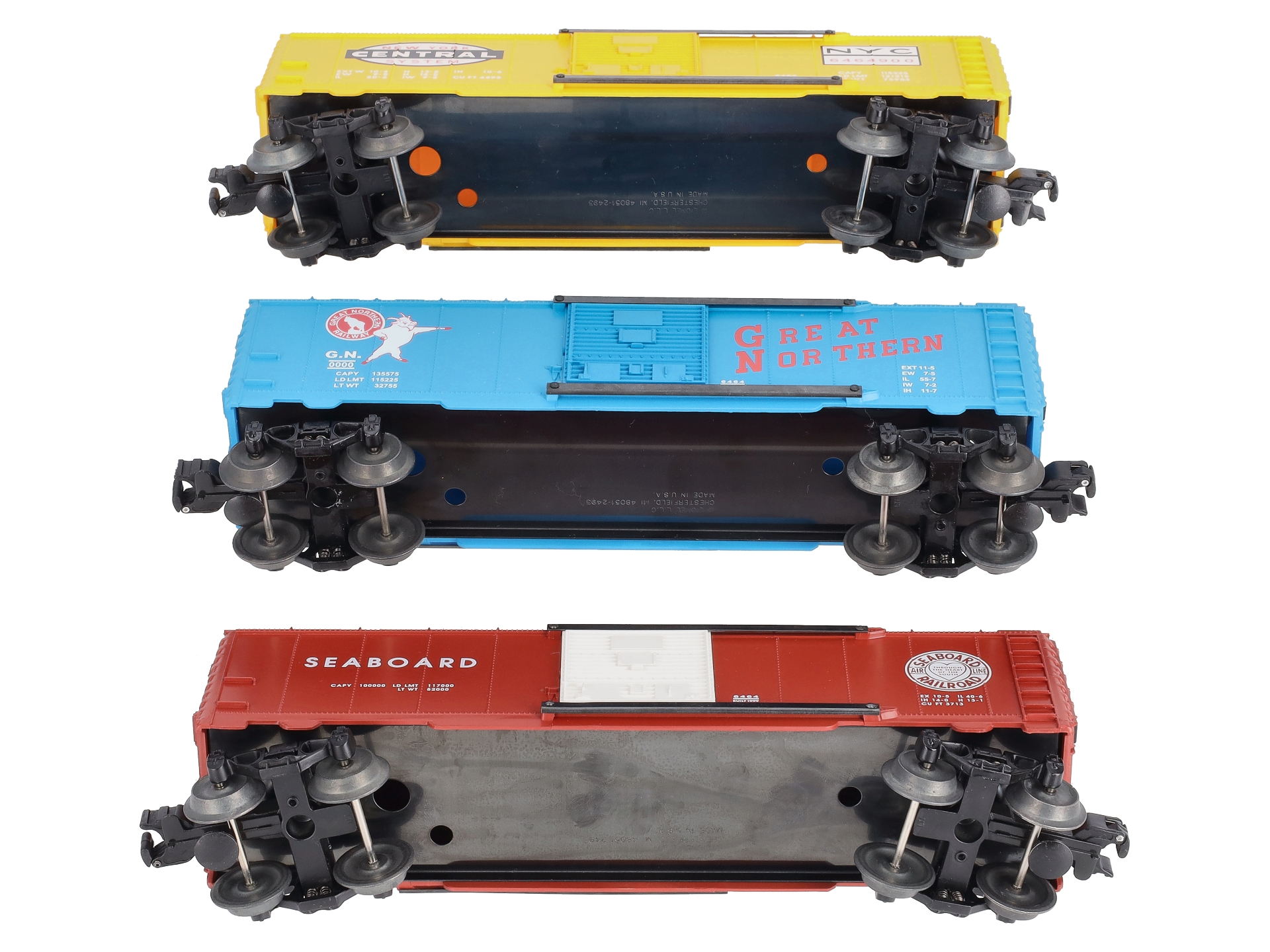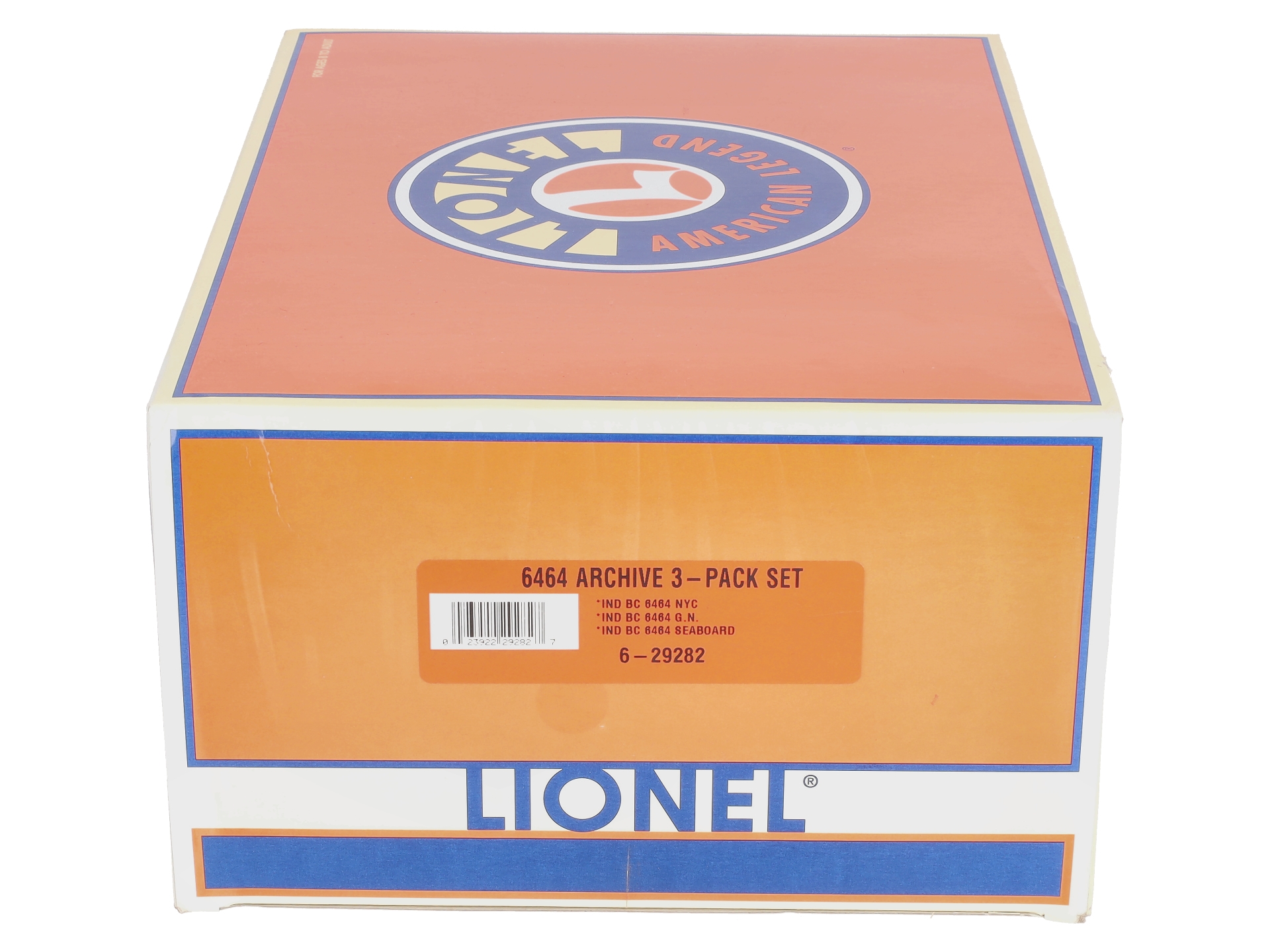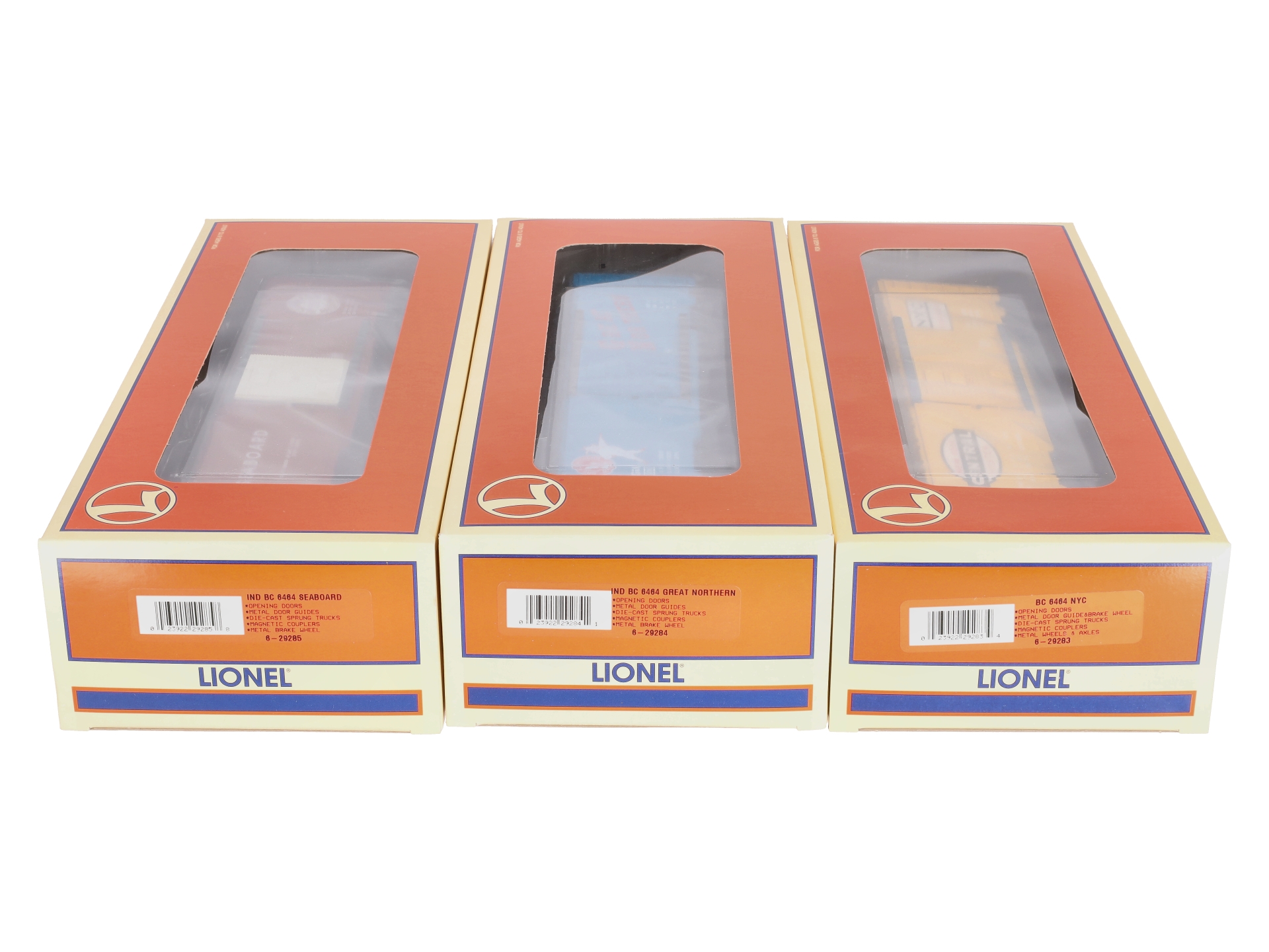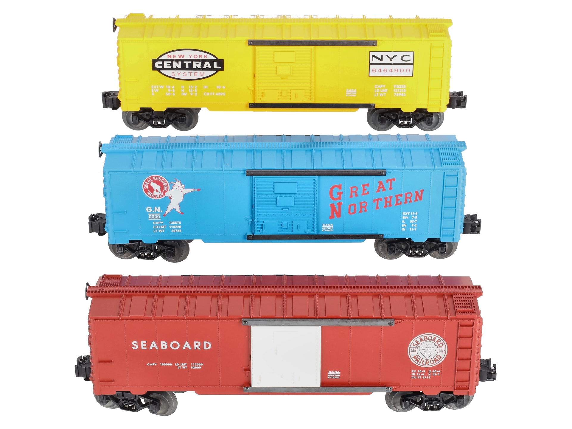 This is a Lionel 6-29282 O Gauge 6464 Archive Boxcar Set (Set of 3). Key features of these cars include a durable plastic construction with a metal frame, die-cast sprung trucks, sliding doors with metal door guides, metal brake wheels, metal wheels & axles, and die-cast operating knuckle couplers. Set Includes: 6-29283 New York Central 6464-900, 6-29284 Great Northern 6464, and 6-29285 Seaboard 6464. Length: 10-1/2, and Minimum curve: O-27.