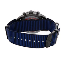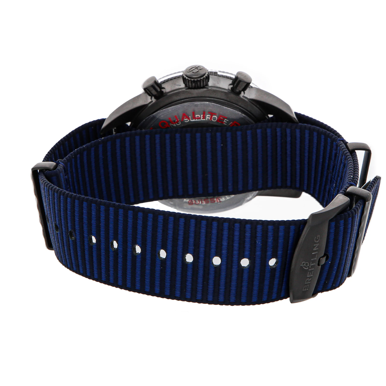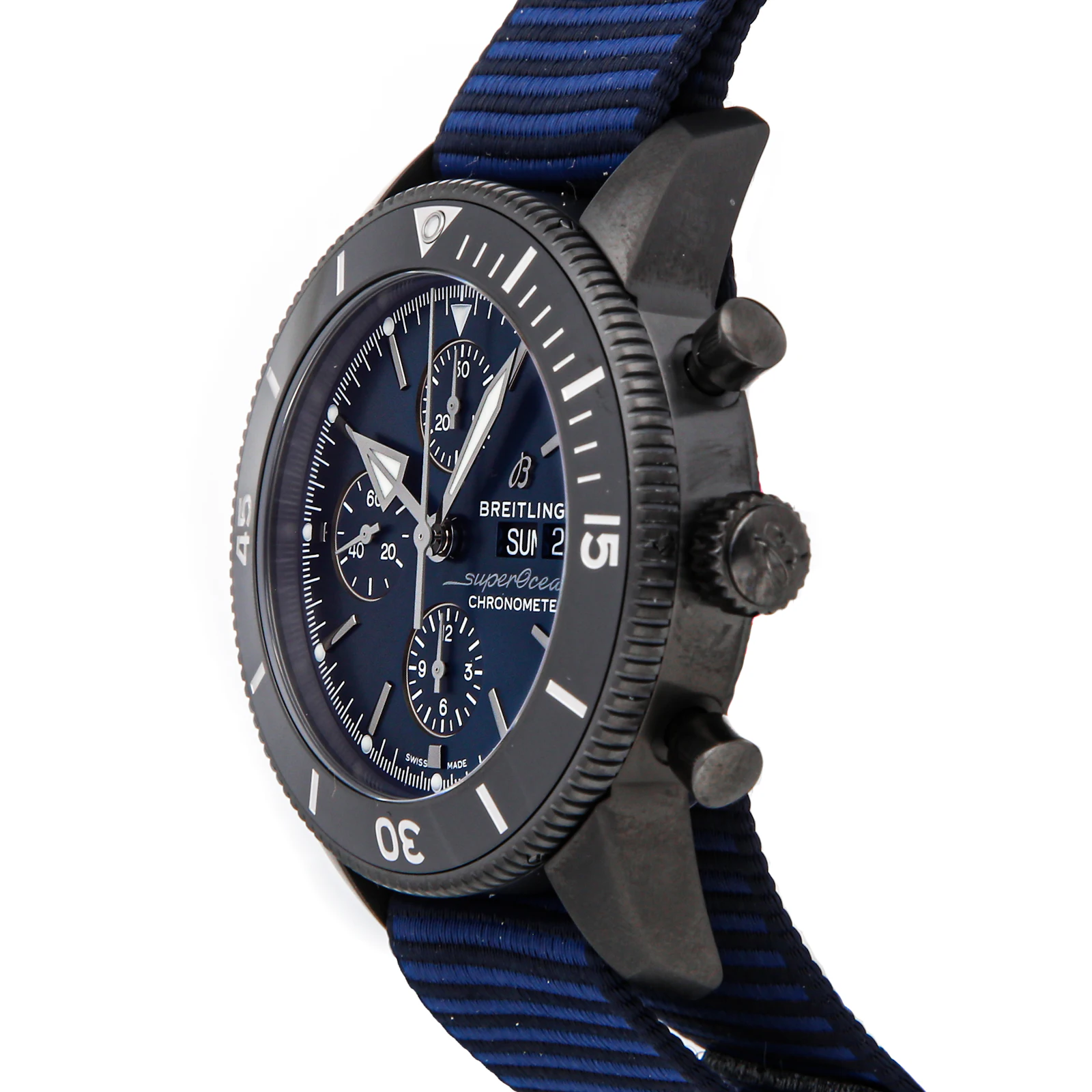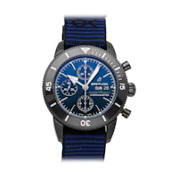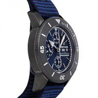 Pre-Owned Breitling Superocean Heritage Chronograph Outerknown (M133132A1C1W1) self - winding automatic watch, features a 44mm black DLC-coated stainless steel case and bidirectional ratcheted rotating bezel surrounding a blue index dial. Watch is secured on a blue fabric strap complete with a black DLC-coated stainless steel tang buckle. Functions include hours, minutes, small seconds, date, day and chronograph. This watch comes complete with the original box and papers. Time remaining on the factory warranty!