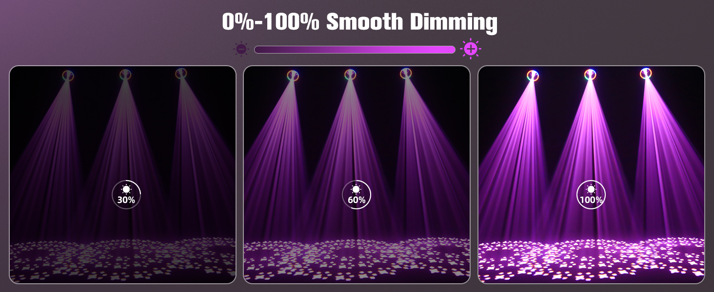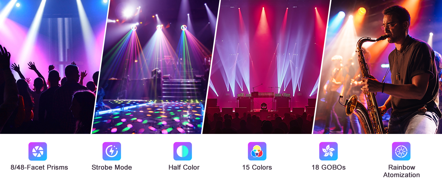 A large 152MM high-definition optical lens paired with an advanced light control system ensures intense beams, smooth color transitions, and sharp patterns (prism, rainbow, frost) with consistent saturation.