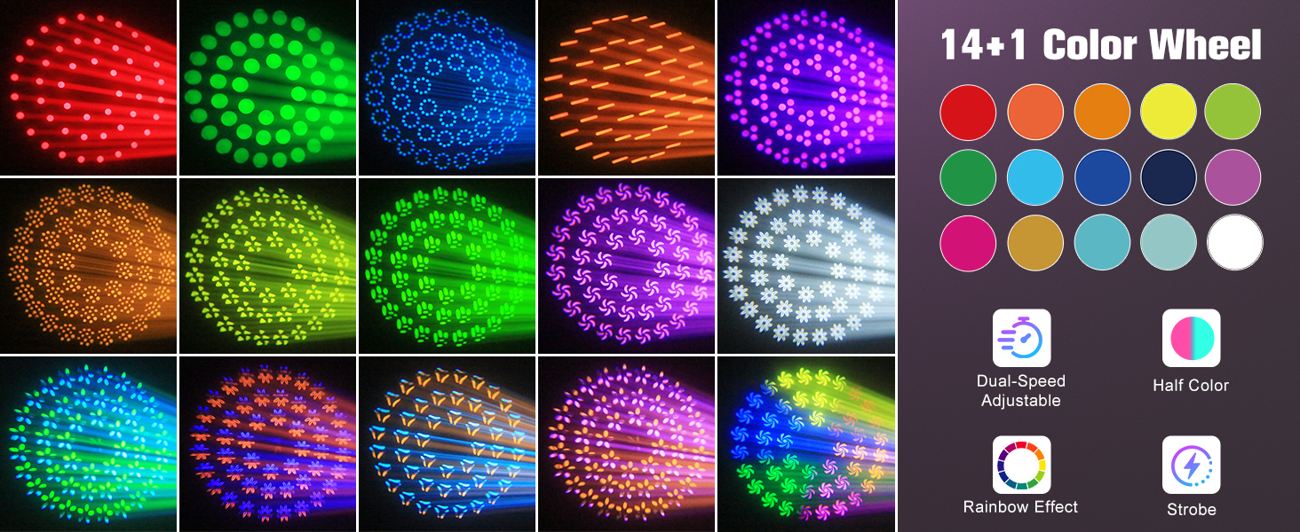 Color disk: 14 colors + white (two-way speed change, rainbow effect speed adjustable, with half-color color effect)