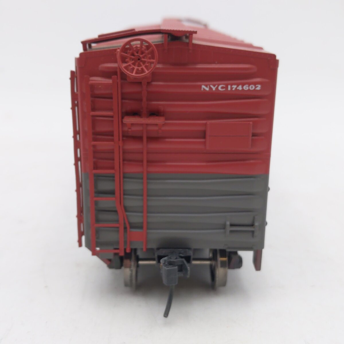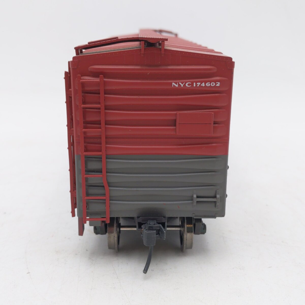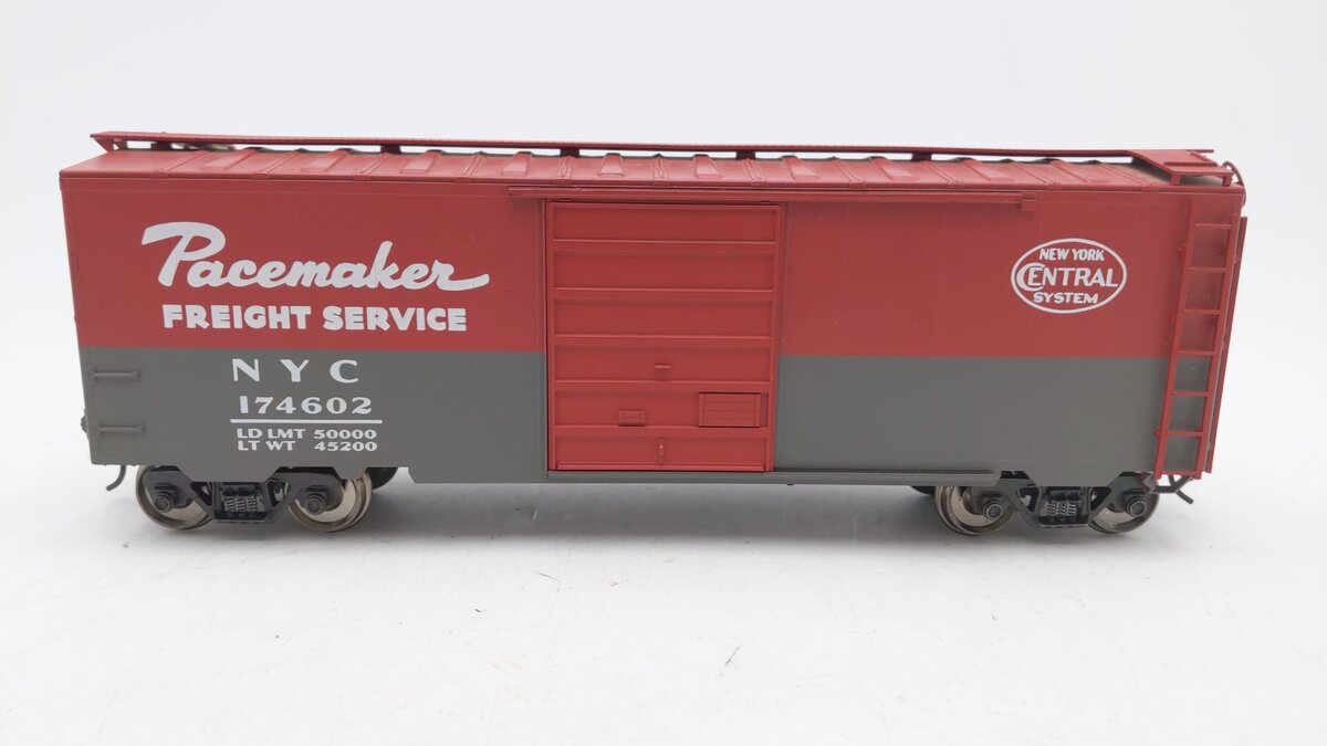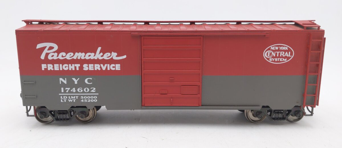 Here is an Weaver 3058 O Scale New York Central Pacemaker PS-1 40' Boxcar No. 174602. This boxcar features plastic trucks, plastic wheels and axles, operating knuckle couplers, a detailed underframe, and sliding doors. It measures approximately10 1/2" long and will operate on 2-Rail track. Road number 174602.