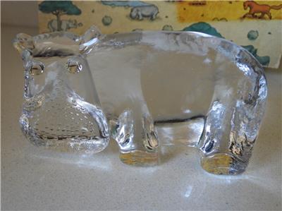 FOR SALE is this fabulous art glass Paperweight / Sculpture in the form of a HIPPOPOTAMUS standing being part of the zoo series of the 1970's. made by Bertil Vallien #97702-3. Made in Sweden by Kosta Boda designed by Bertil Vallien. Clear glass flat back sculpture so that it can fit right up close to a wall etc. Comes in the original gorgeous box.