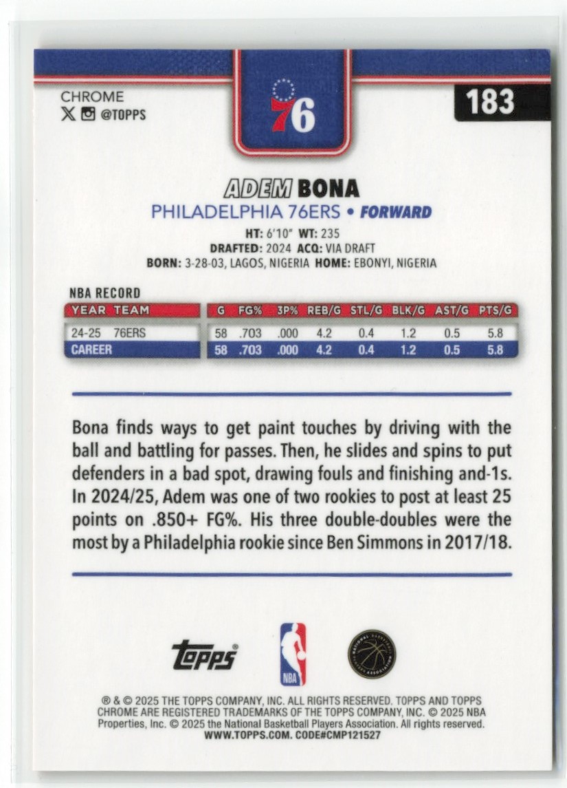 | 2025-26 Topps Chrome Adem Bona #183 Orange Refractor /25 76ers |