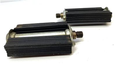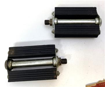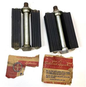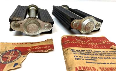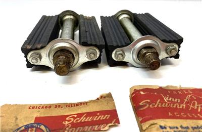 New old stock Schwinn Bicycle Co #6503 "bottle cap" pedals. 4" long by 2-7/8" wide. Typically found on more deluxe men's bikes in the late 40's or 1950's. Slightly dirty from storage/age, but new. 1/2" threads fits on 1 piece cranks. These have a small ding on one of the pedal shafts and minor discoloration on one pedal cap. Partial wrapper included.