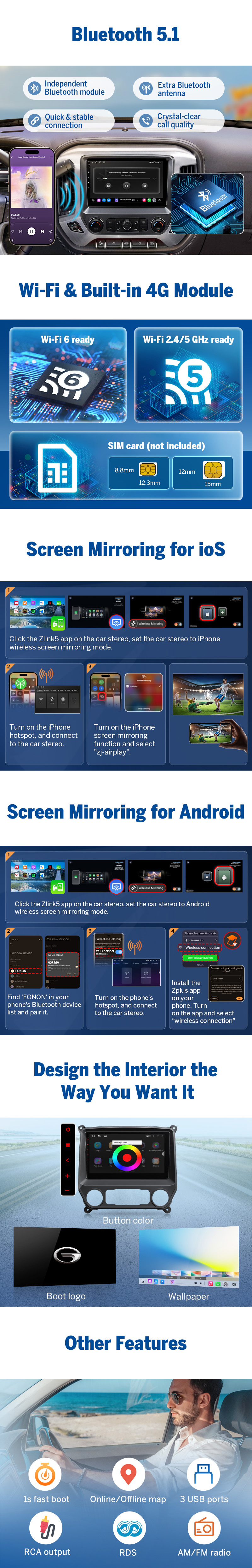 6GB RAM + 64GB ROM | Wireless Apple CarPlay & Android Auto | Built-in 4G LTE | 10.1" QLED HD Display | DSP Hi-Fi Audio | WiFi 6 | GPS Navigation | OTA Updates | Factory Feature Retention