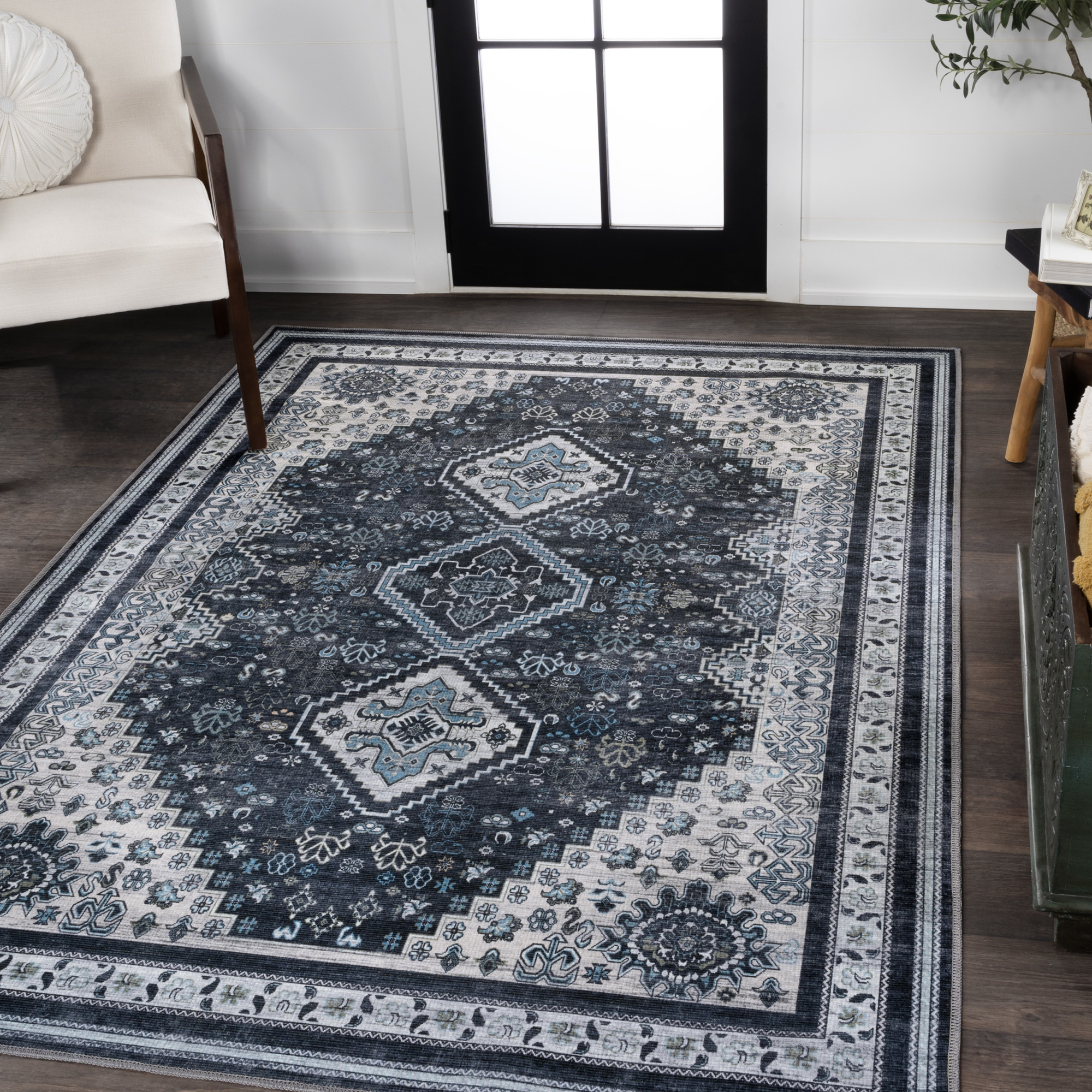 Item DescriptionThe diamond-shaped medallion in the center of this rug's design recalls vintage Persian rugs with their vibrant color palettes. A geometric border adds to the vintage charm. This pet friendly rug is forgiving of spills and easy to care for; it's a versatile classic perfect for a dining room, living room, kitchen, bedroom or porch.