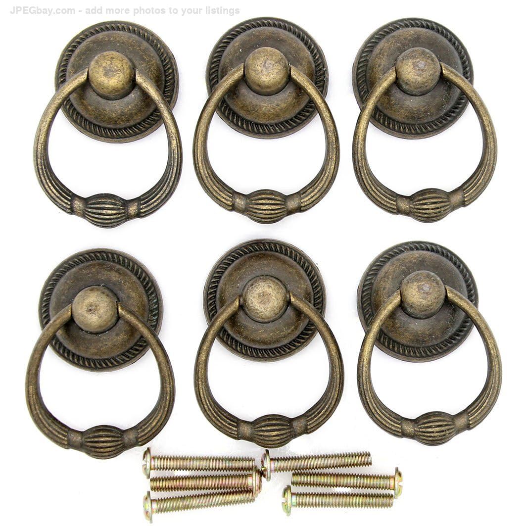 These vintage style drop ring pulls with distressed antique brass finish are a perfect addition to any kitchen cabinet, cupboard, desk, drawer, wardrobe, dresser, chest, etc.--Made from high-quality zinc alloy and finished with antique brass tone.--Large size: The diameter of domed base is 1.2 inches (31.5 mm). The ring outer diameter is 1.4-in (36 mm), and the overall vertical height of this pull handle is 2.1-in (54 mm).--Each ring pull has a single mounting hole.--Pack of 6 and crown bolts are included.