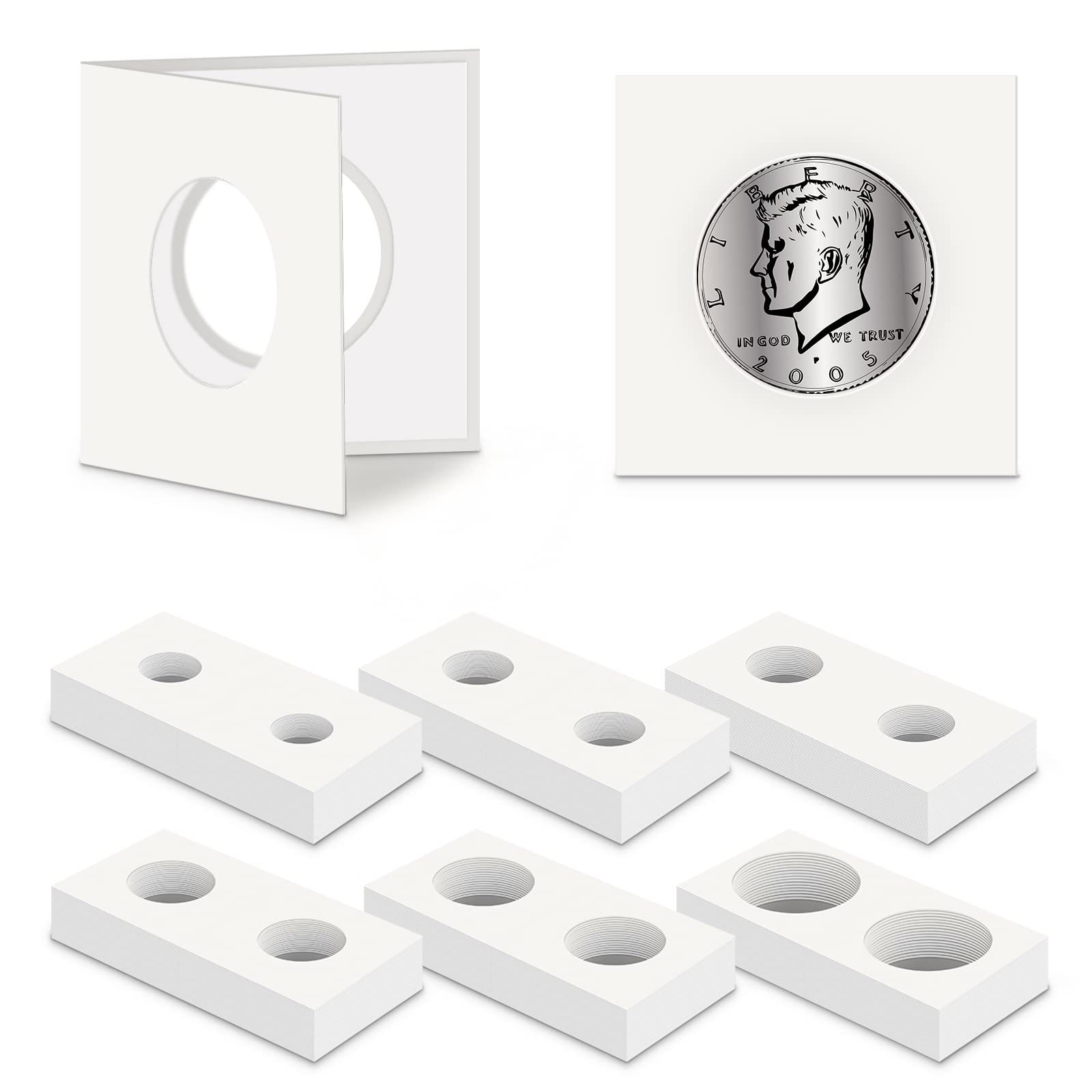 Suitable Self Adhesive Coin Flips size: The window has six different sizes, 40mm/1.57inch, 31.5mm/1.24, 25mm/0.98, 27.5mm, 23mm/0.9, 20.5mm/0.8inch, suitable for 50 pence/dime, 50 quarter One dollar, 50 and a half dollars, 50 small dollars, 50 big dollars