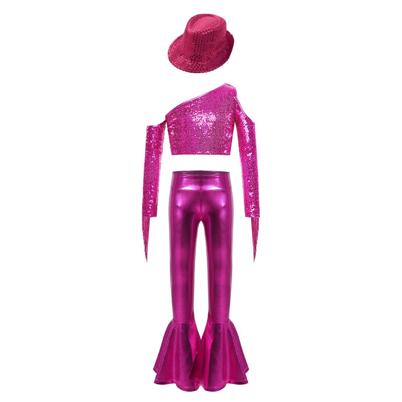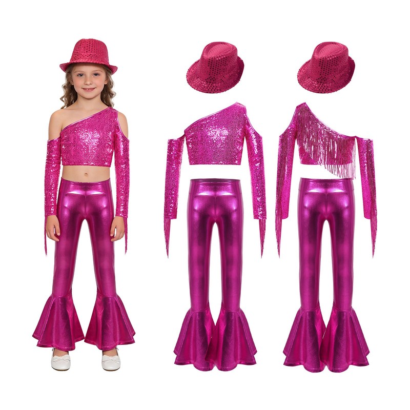 The elastic waistband on the pants ensures a snug fit, the bell-bottom and metallic design give a retro and stylish vibe. Come with a sequin hat.