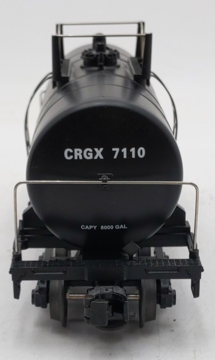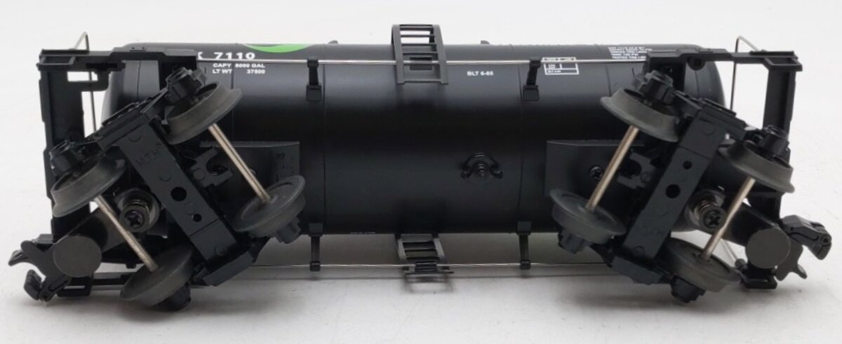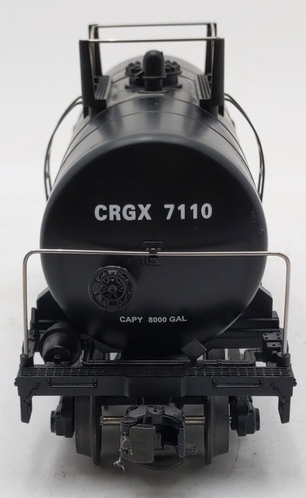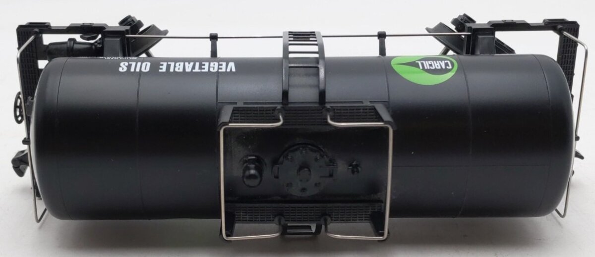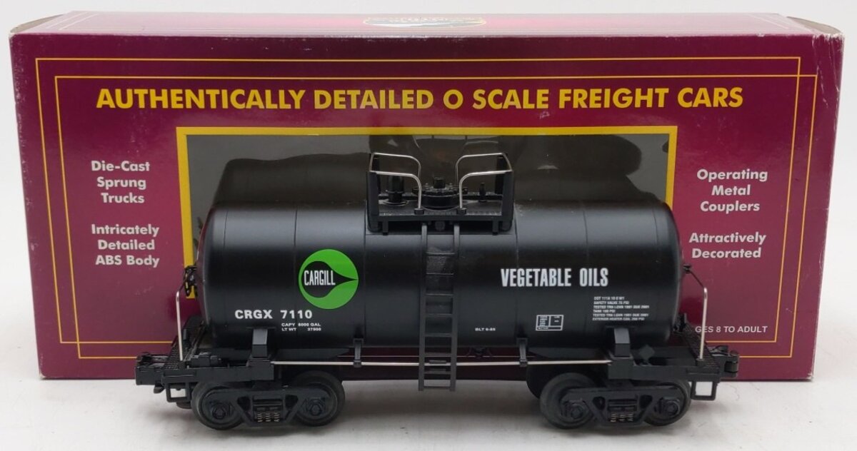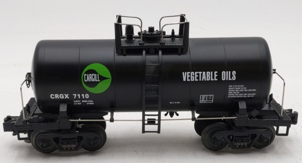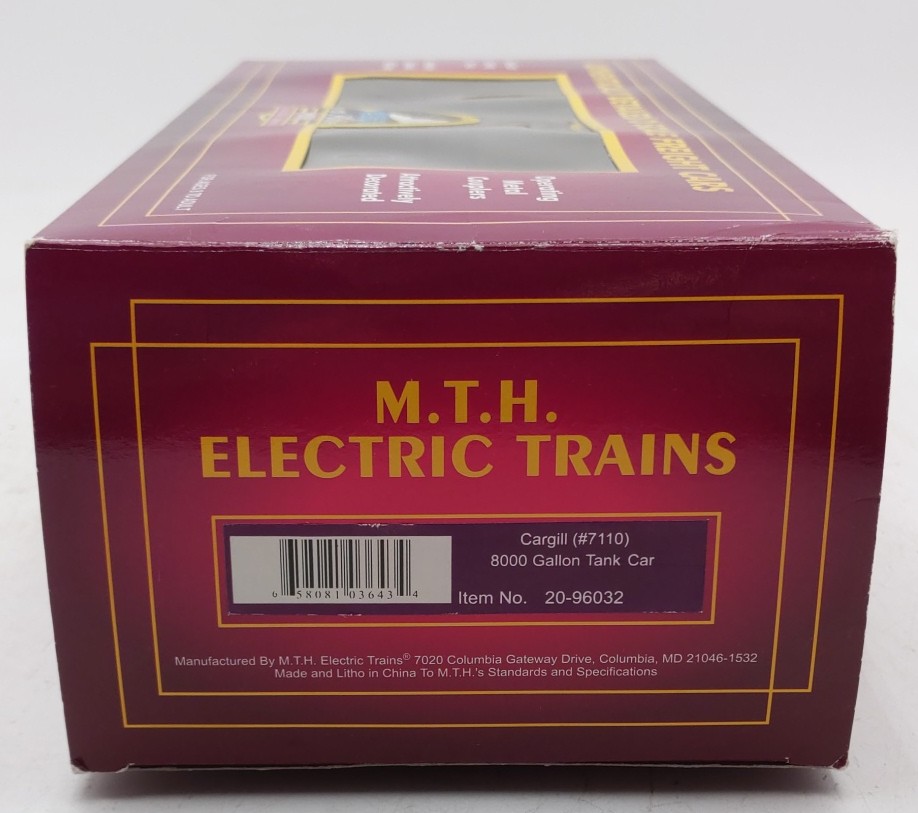 Here is a MTH 20-96032 O Gauge Cargill 8,000 Gallon Tank Car #7110. This tank car features a durable plastic construction with separately applied trim parts, die-cast metal sprung trucks, metal wheels and axles, and operating knuckle couplers.
