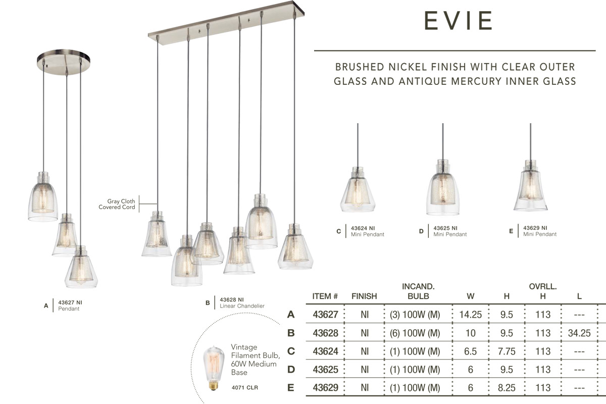- The Kichler Evie 43627 is offered in a Brushed Nickel finish