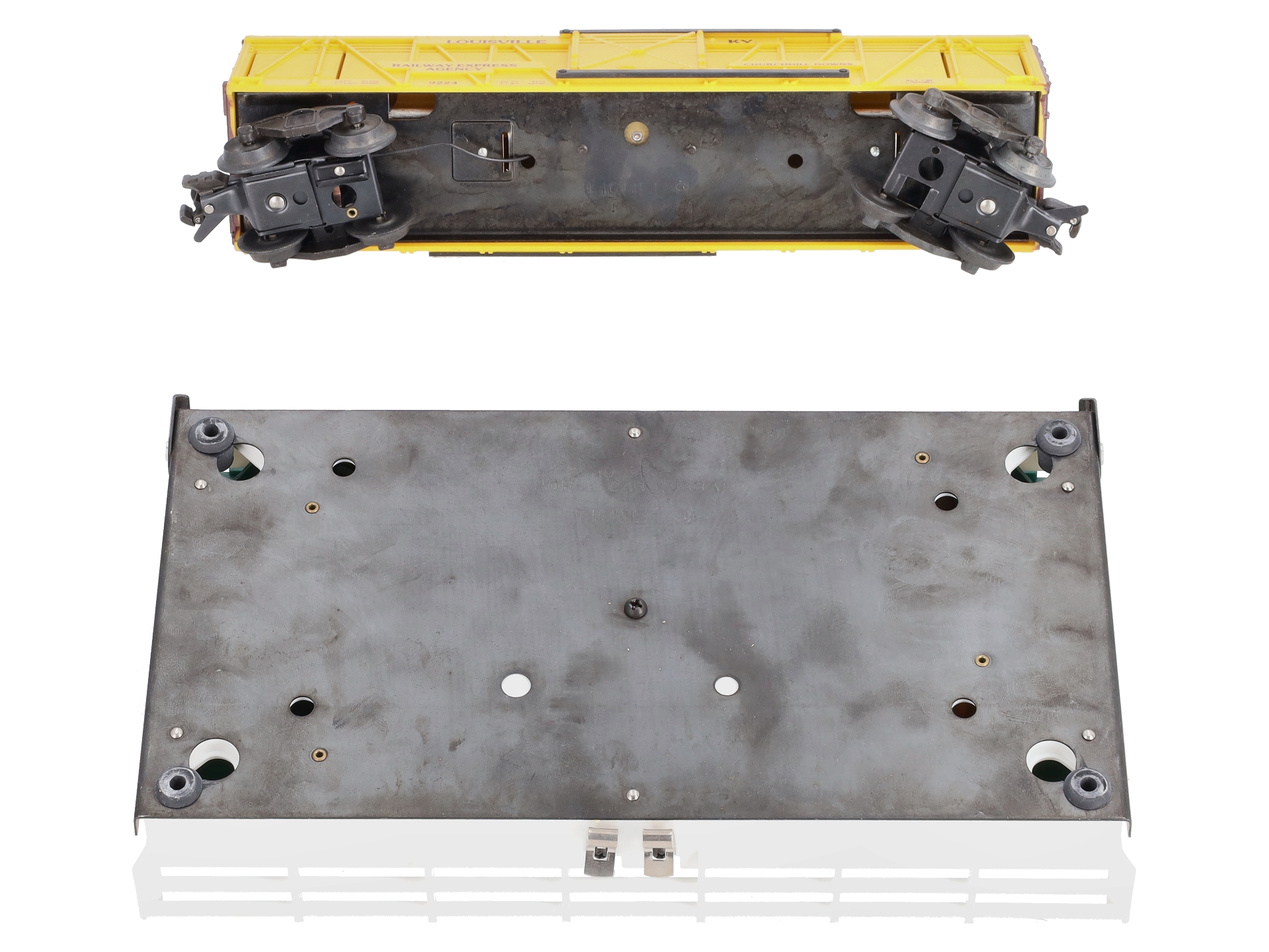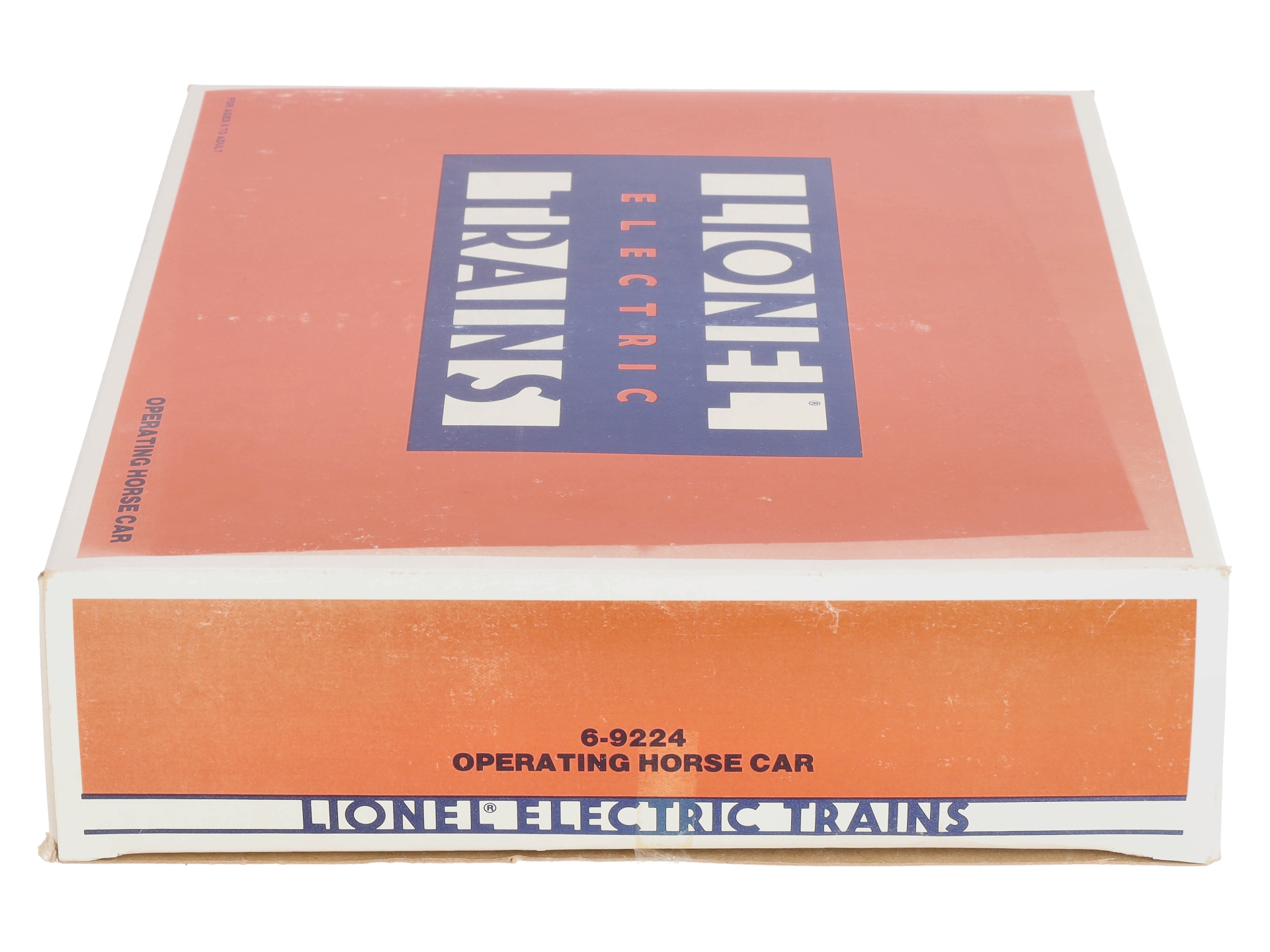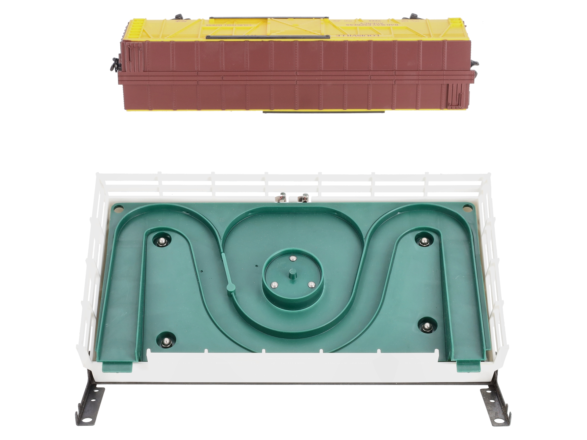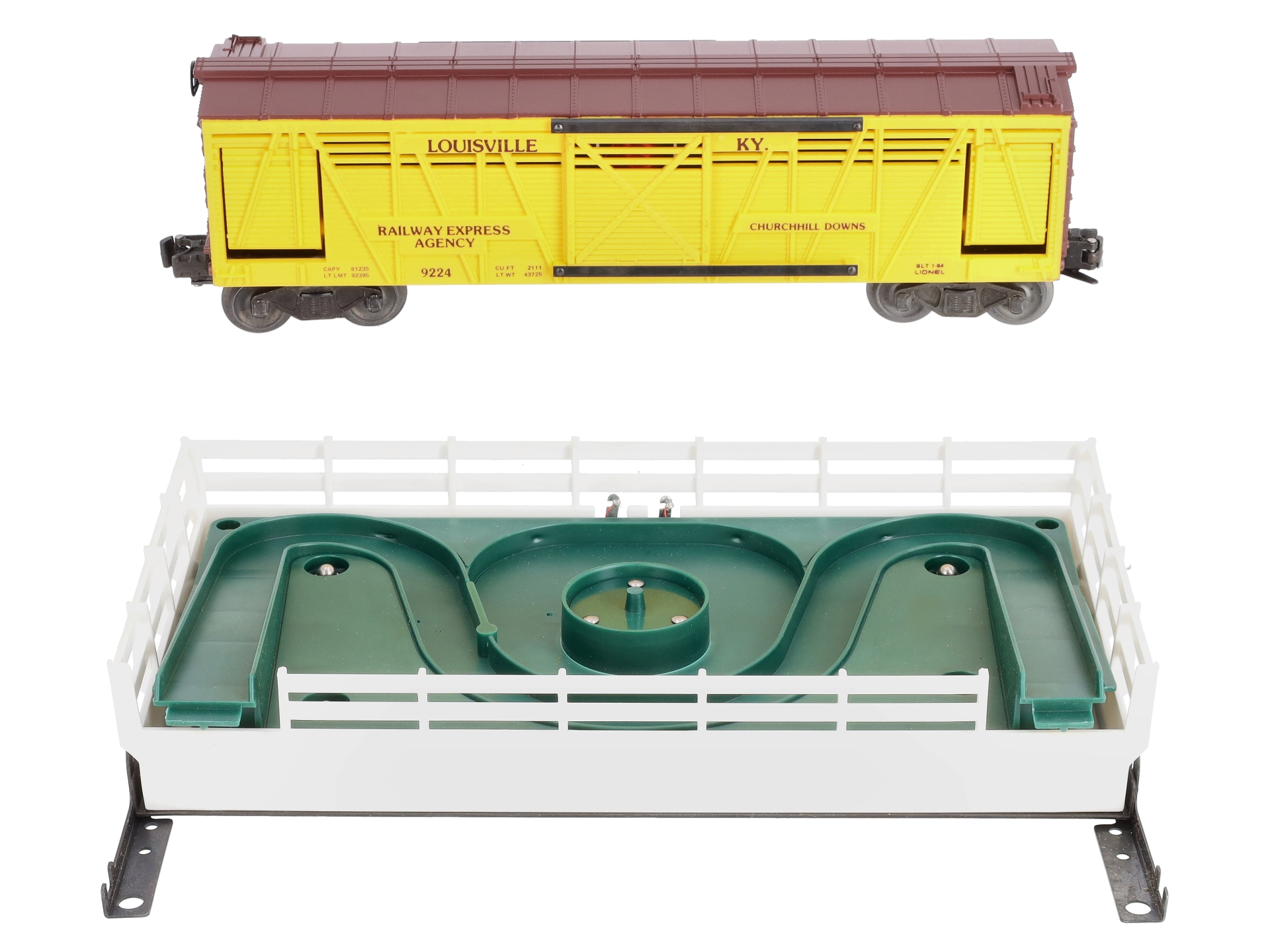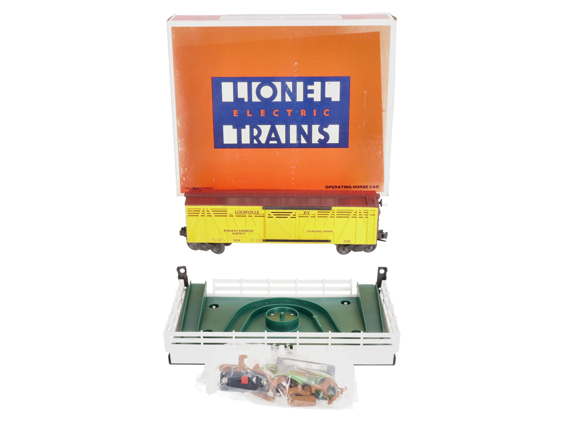 Here is a Lionel 6-9224 O Gauge Churchill Downs Operating Horse Car Set. This neat accessory is re-release of the postwar 3356 operating horse car set. When activated, the doors on the car swing down and the car and platform vibrate, causing the horses to move around the coral and in and out of the car. It is a really neat accessory. The set includes the car, corral, horses, the OTC track trip, hookup wires and the control button. This horse car features sliding doors, die-cast metal trucks, die-cast metal operating knuckle couplers, & metal wheels and axles.