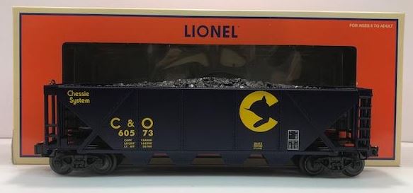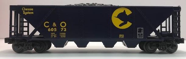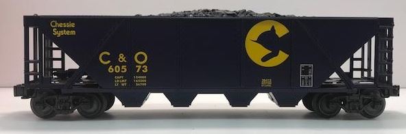 This 4-Bay Hopper Features Die-cast metal sprung trucks and operating couplers, Coal load, Gauge: Traditional O Gauge, and the Dimensions are: Length: 11 -3/4"