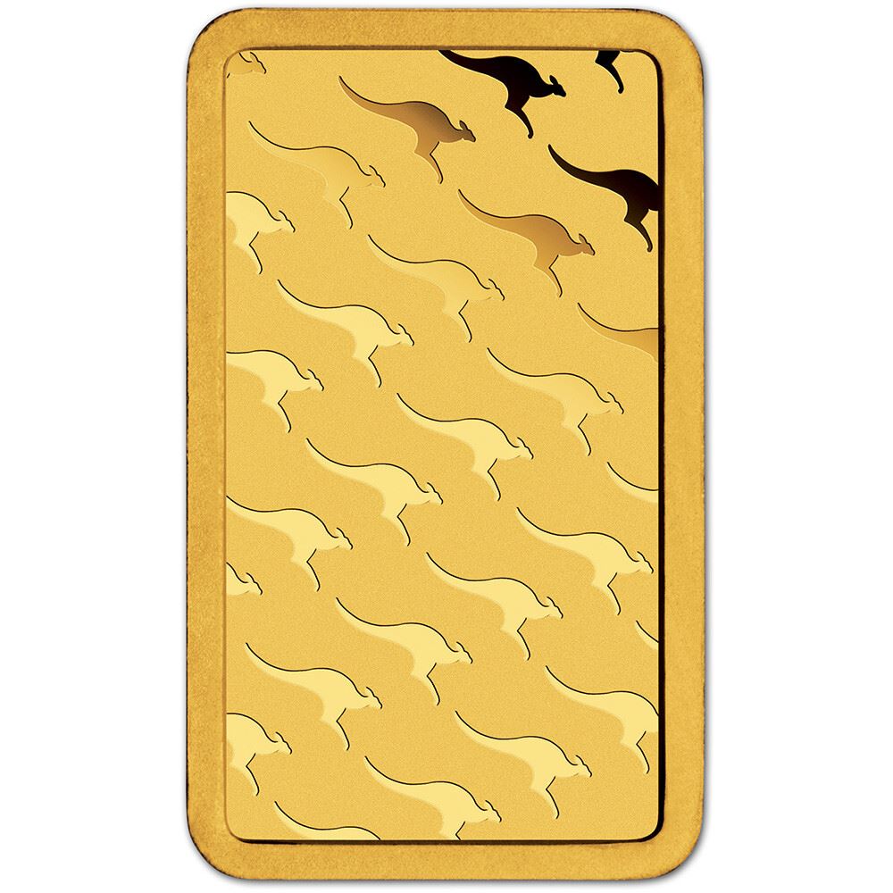 The reverse of each bar is decorated with wallpapered silhouettes of jumping kangaroos, a native species of the Australian outback where gold has been mined commercially since 1851.