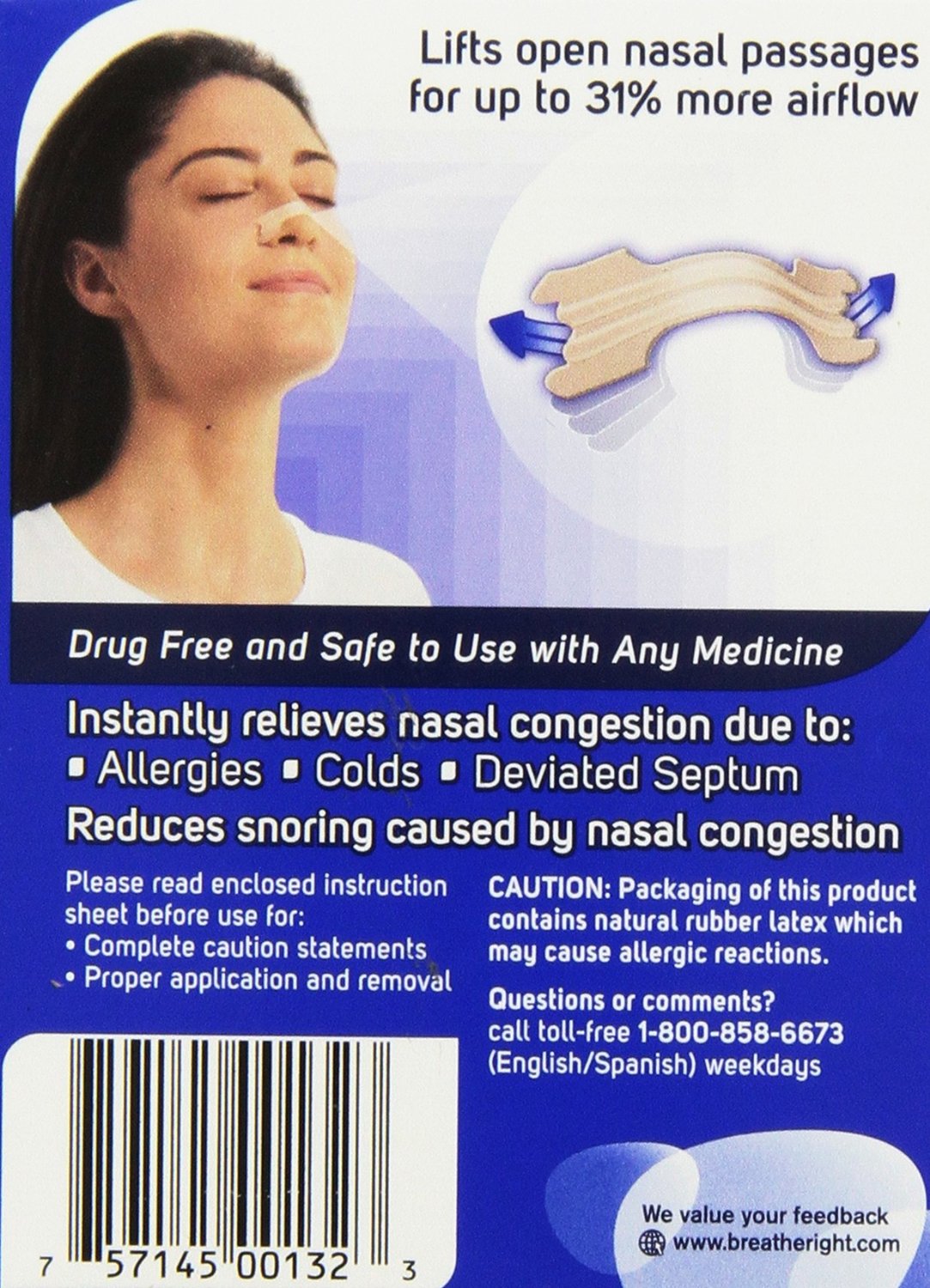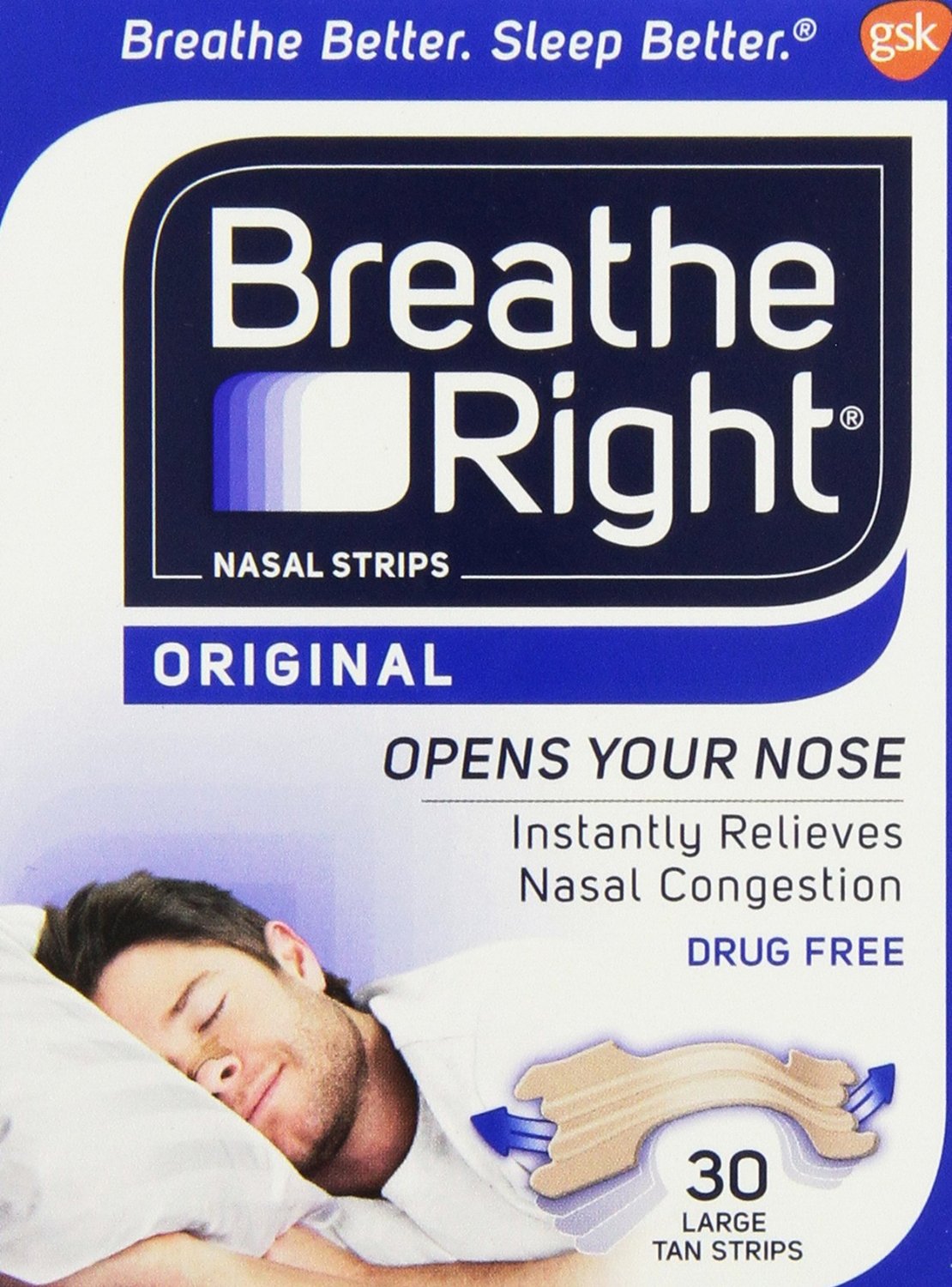 Nasal congestion (or a blocked nose) can make you breathe through your mouth instead of your nose which may cause snoring and a bad night’s sleep for you and your partner. Breathe Right Nasal Strips gently open your nasal passages helping you to breathe better by providing temporary relief from nasal congestion and stuffiness which can be caused by colds and allergies. Each drug-free nasal strip consists of flexible “spring-like” bands that when placed correctly across the nose, gently opens the nasal passages to make breathing easier.