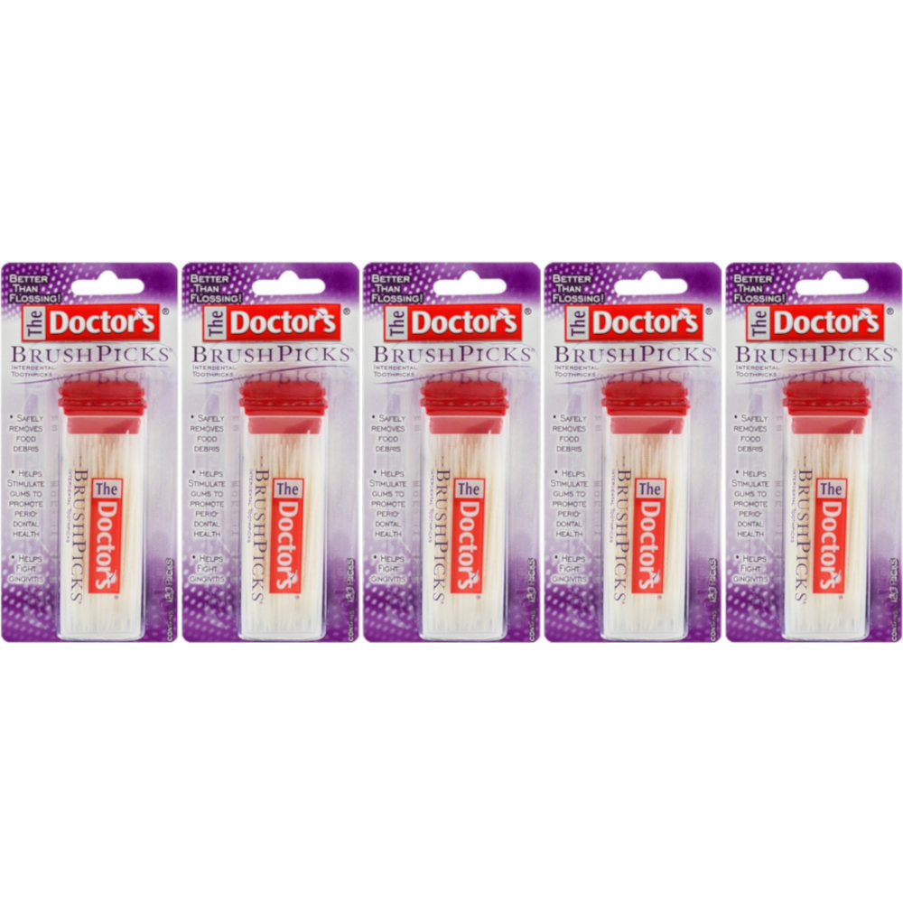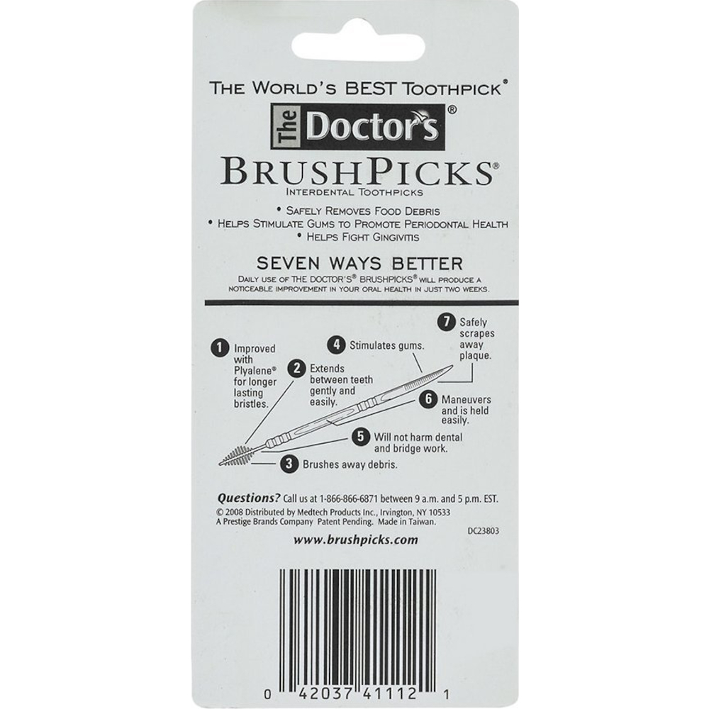 The world's best toothpick. Better than flossing. Safely removes plaque and food debris. Stimulates gums to promote periodontal health. Fights gingivitis. Longer head with more bristles. 7 Ways Better. Daily use of the doctor's brushpicks will produce a noticeable improvement in your oral health in just two weeks. Features: Improved with Plyalene for longer lasting bristles. Extends between teeth gently and easily. Brushes away debris. Stimulates gums. Will not harm dental and bridge work. Maneuvers and is held easily. Safely scrapes away plaque.
