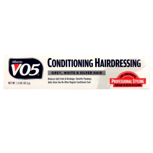 VO5 Conditioning Hairdressing Gray/White/Silver Blonde Hair. Revitalize dull, dry hair. The unique formula has an advanced blend of five of the earth's best moisturizers and emollients. 100% concentrated - contains no water or alcohol. Control your split ends. Smooth fly a ways. Calm frizzies. Add shine. Give your hair great manageability. Directions: Squeeze out a tiny amount into the palm. Massage between palms. Apply just where needed. Add shine by working into hair. Let natural highlights shine through.
