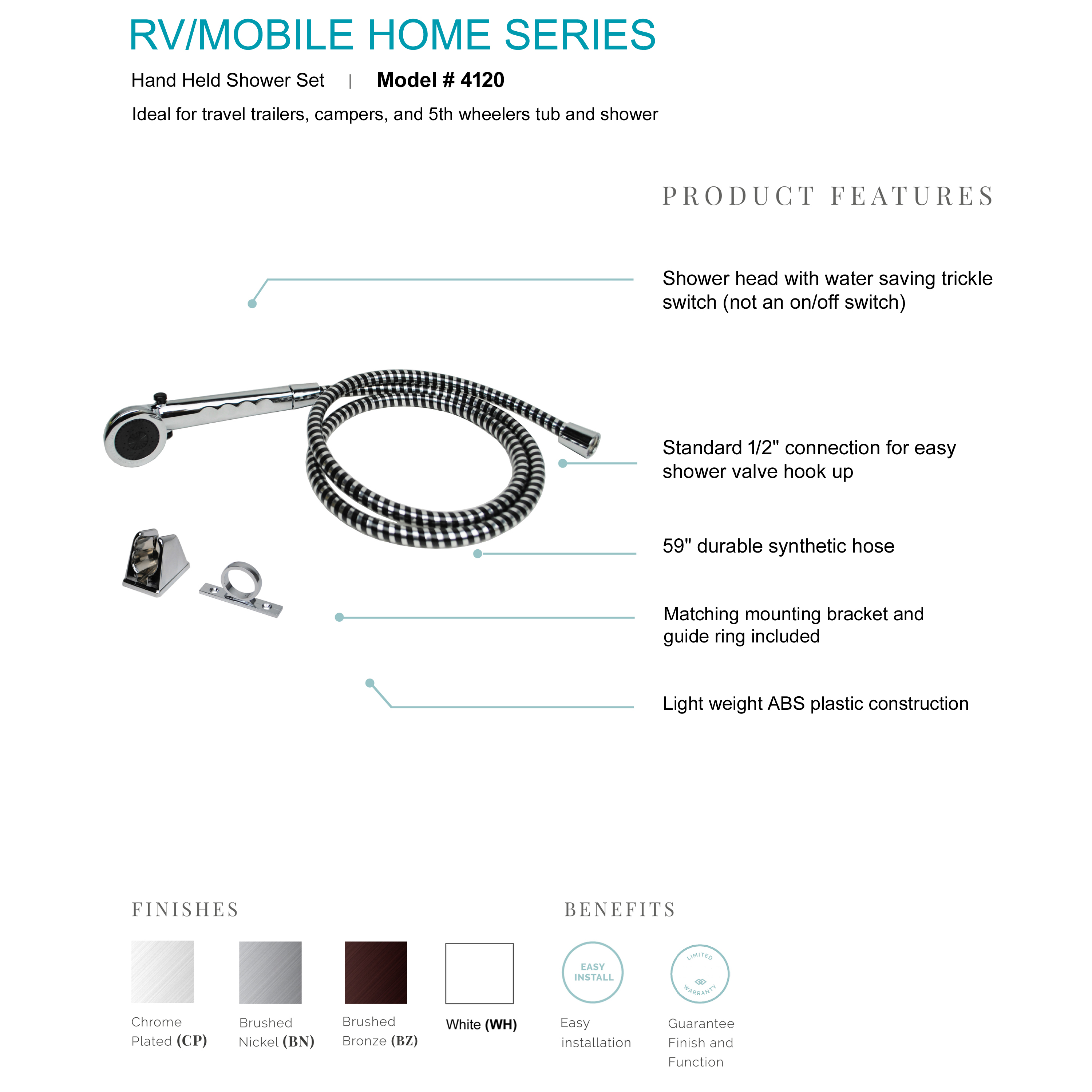 RV/Mobile Home Series model # 4120BN. Brand new non-metallic hand-held shower set. Premium quality. Ideal for travel trailers, campers, and 5th wheelers.