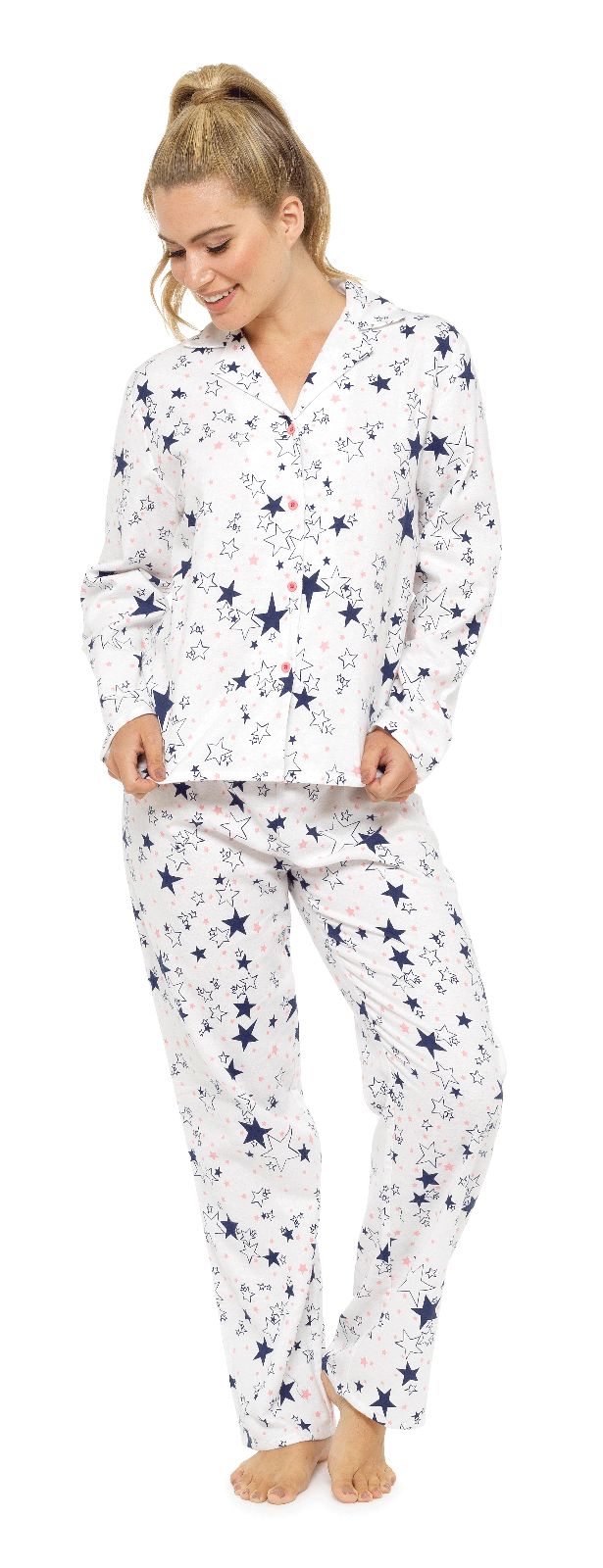The Revere Collar Ladies' Wince Pyjamas feature a classic and comfortable design, crafted from pure cotton for excellent breathability and softness. The set includes a button-up jacket with a revere collar, adding a touch of elegance, and long sleeves for full coverage—ideal for cooler nights or year-round wear. The elastic waist trousers offer a relaxed fit and easy movement, ensuring comfort throughout the night. Designed for lounging or sleeping, these pyjamas combine softness and practicality.