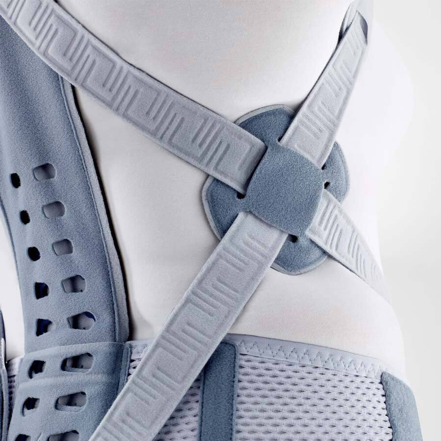 Die Wirbelsäulenorthese richtet passiv und aktiv auf. Ihre Beckenbandage aus luftig-elastischem Netzmaterial schließt unterhalb des Bauches und stabilisiert das Becken für einen sicheren Gang. Der lange Hebel des Aluminium-Reklinators stabilisiert die Brustwirbelsäule. Über das doppelt gekreuzte Zuggurtsystem wird er formschlüssig an die Wirbelsäule gedrückt und die aufrichtende Kraft gezielt eingeleitet. Bei Fehlhaltungen ermahnt ein leichter Wiederstand, sich auch selbständig aufzurichten und trainiert die obere Rückenmuskulatur. Das korrigiert die Haltung und wirkt einer Kyphosierung entgegen. Die gepolsterten seitlichen Gurtkreuze setzen propriozeptive Reize und erhöhen so das Stabilitätsgefühl.