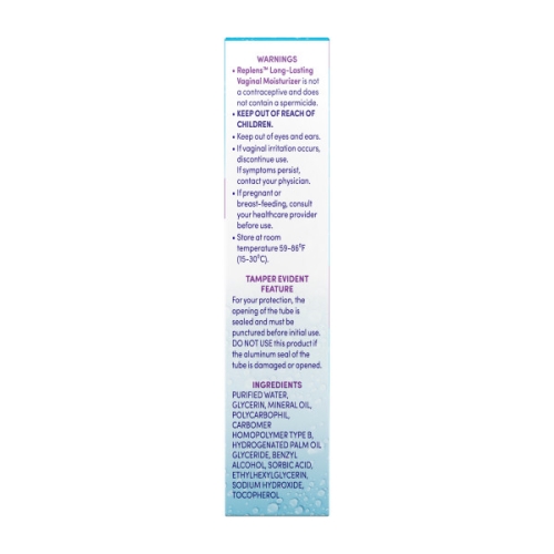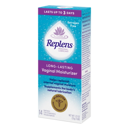 Replens helps replenish vaginal moisture and provides long-lasting results.;Comfortable applicator delivers just the right amount of long-lasting vaginal moisturizer to provide vaginal moisture at the source of discomfort.;The patented formula keeps Replens in place to deliver moisture for long-lasting hydration with less mess.;Compatible with natural rubber latex, polyisoprene, and polyurethane condoms.;Estrogen and fragrance free. 14 applications, 1 reusable applicator.