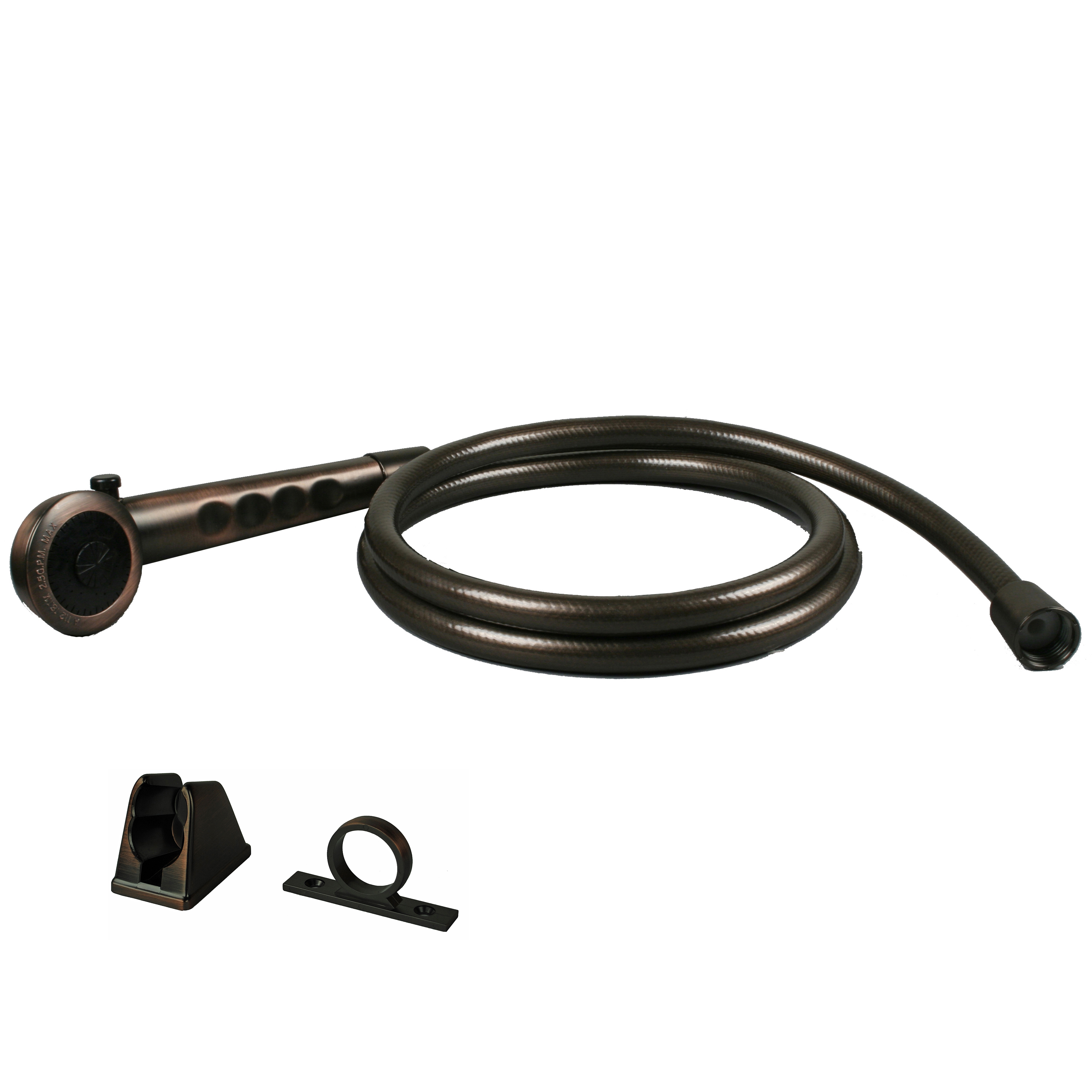 - Hand-held shower head, hose, bracket, and guide ring