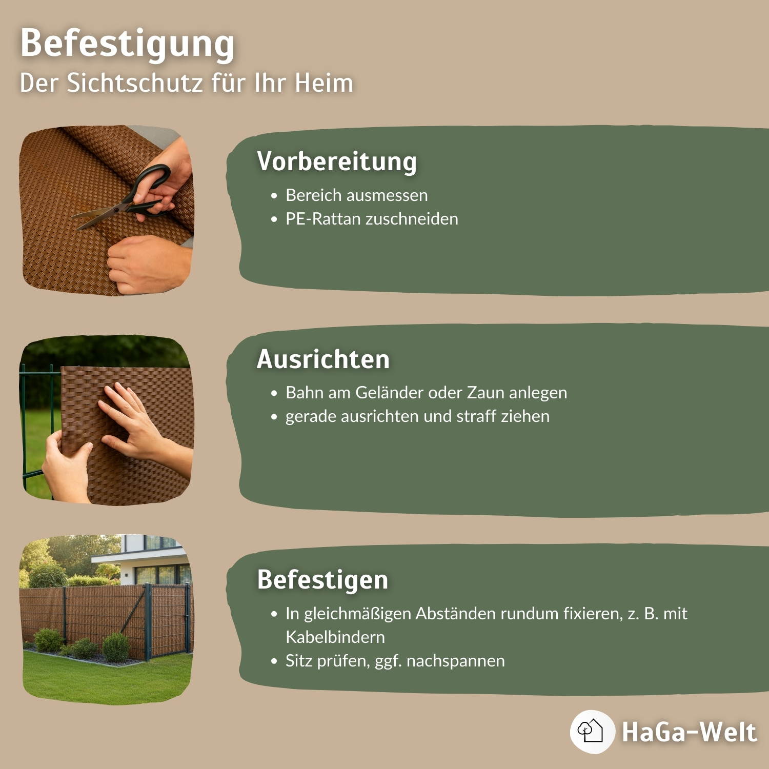 Ein wichtiger Vorteil unseres PE Rattans ist die Kombination aus Stabilität und einfacher Anwendung. Es schützt vor unerwünschten Blicken, lässt sich leicht zuschneiden und unkompliziert montieren. Setzen Sie auf Qualität und Zuverlässigkeit für Ihr Zuhause – mit unserem PE Rattan Sichtschutz.