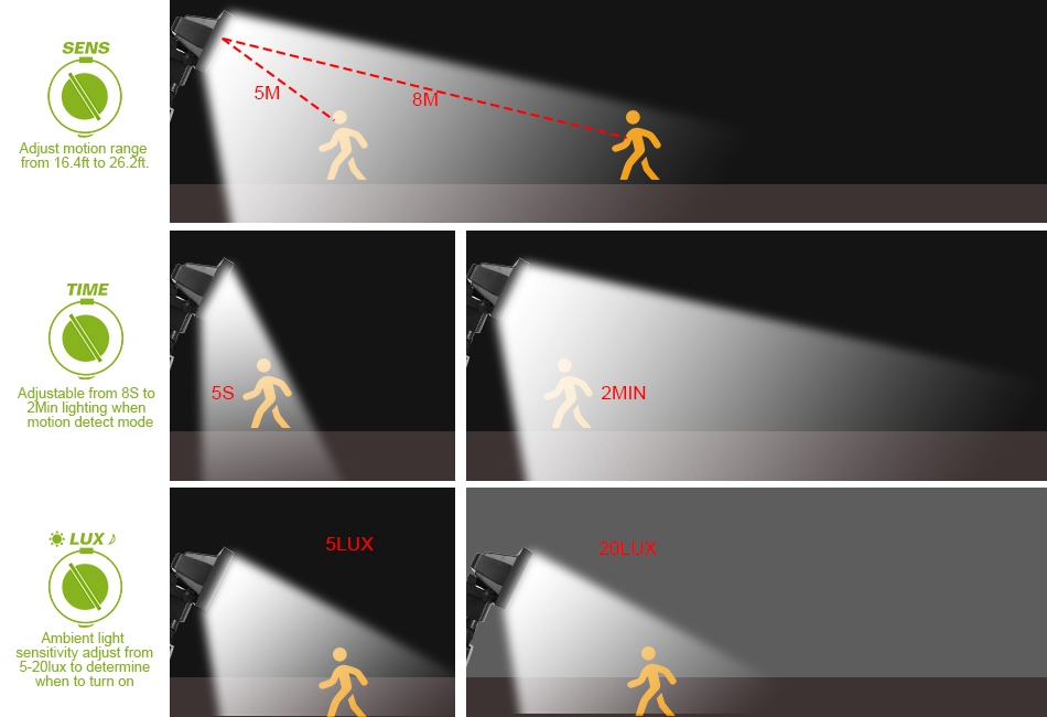 - *3 Control Dials:Adopt 3 Control Dials(LUX,SENS and TIME),you can adjust the light settings via the 3 control dials. The LUX dial controls and measures ambient light,which determines when the unit will turn on as ambient light fades. The SENS dial control determines the distance range of the motion sensor detection from 5m/16.4ft to 8m/26.2ft. The TIME dial control how long the light will stay on after motion from 8S to 2Min.
