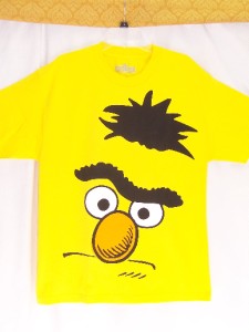 DescriptionErnie always gets 1st billing, but it's really big 'ol Burt who plays it straight. Super-sized Burt is so BIG that he doesn't really even fit on this bright yellow shirt. All that really fits are his eyes, black hair (including uni-brow), and orange nose. This shirt is licensed by Sesame Street.