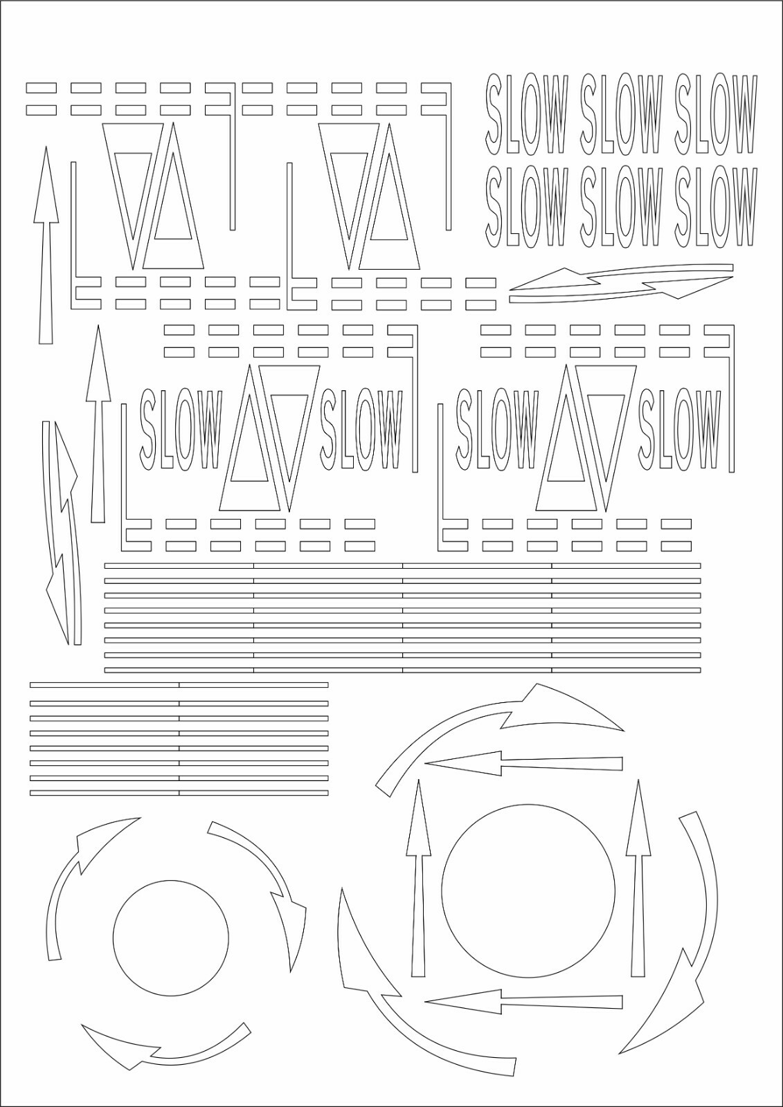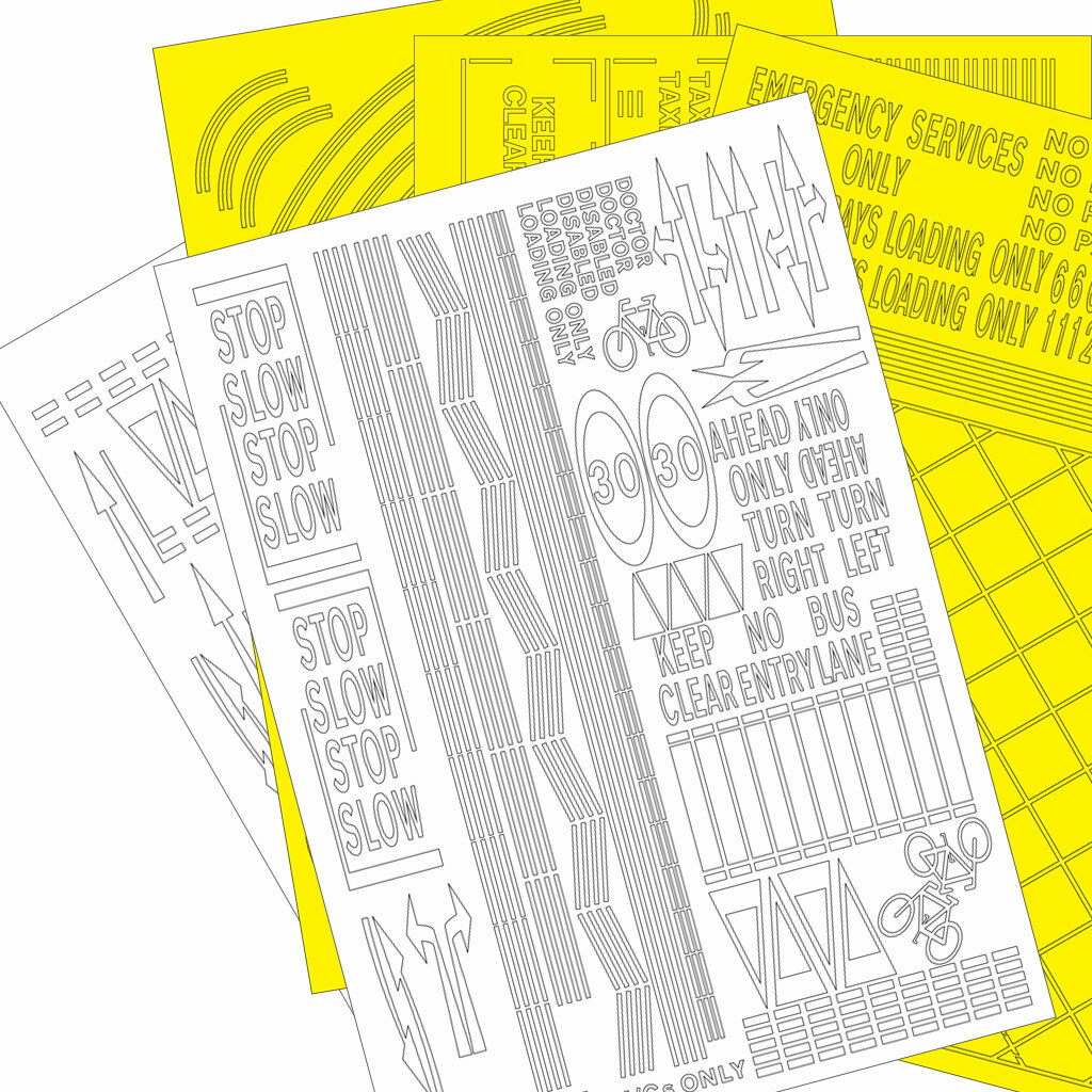 The set comprises of 5 laser cut self-adhesive matt polyester sheets in white and yellow containing a huge selection of graphical & text based modern UK road markings. Also included is a sheet of assorted curved double yellow lines to cater or a range of bends and junctions. The individual straight white and yellow lines can be teased around most bends without any issue. Simply lift the desired markings from the sheet using the tip of a craft knife, then apply to your road surface, rubbing down hard with the tip of your finger once happy with the positioning.