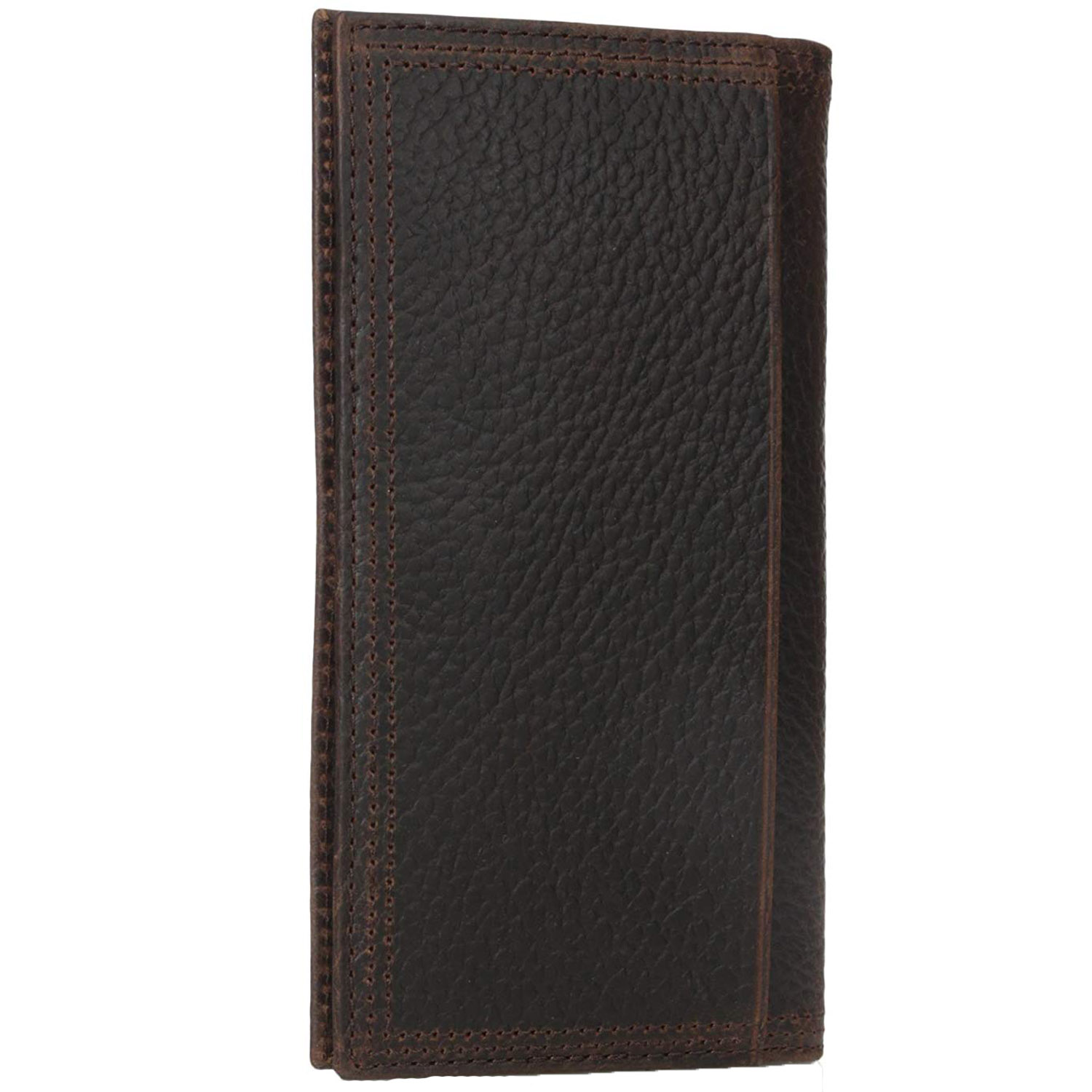 This Ariat Performance Work dark brown top grain leather checkbook cover / rodeo wallet features heavy duty stitching multiple card slots protective ID window and cash divider.