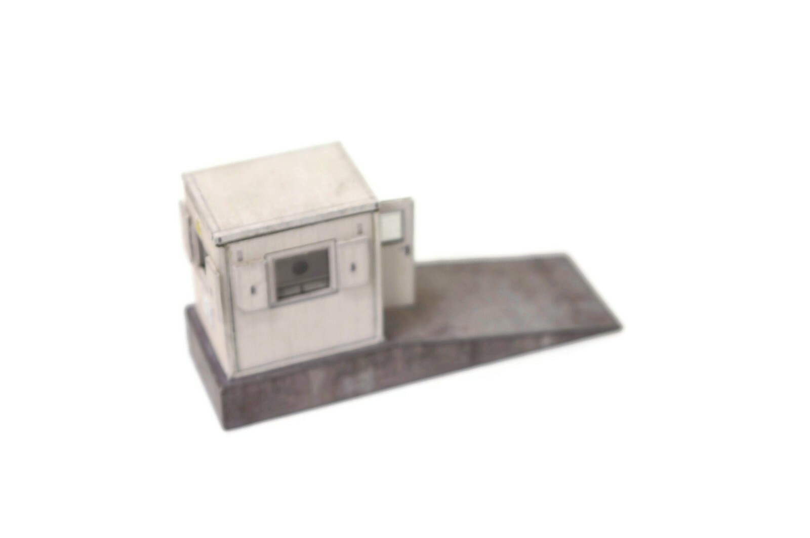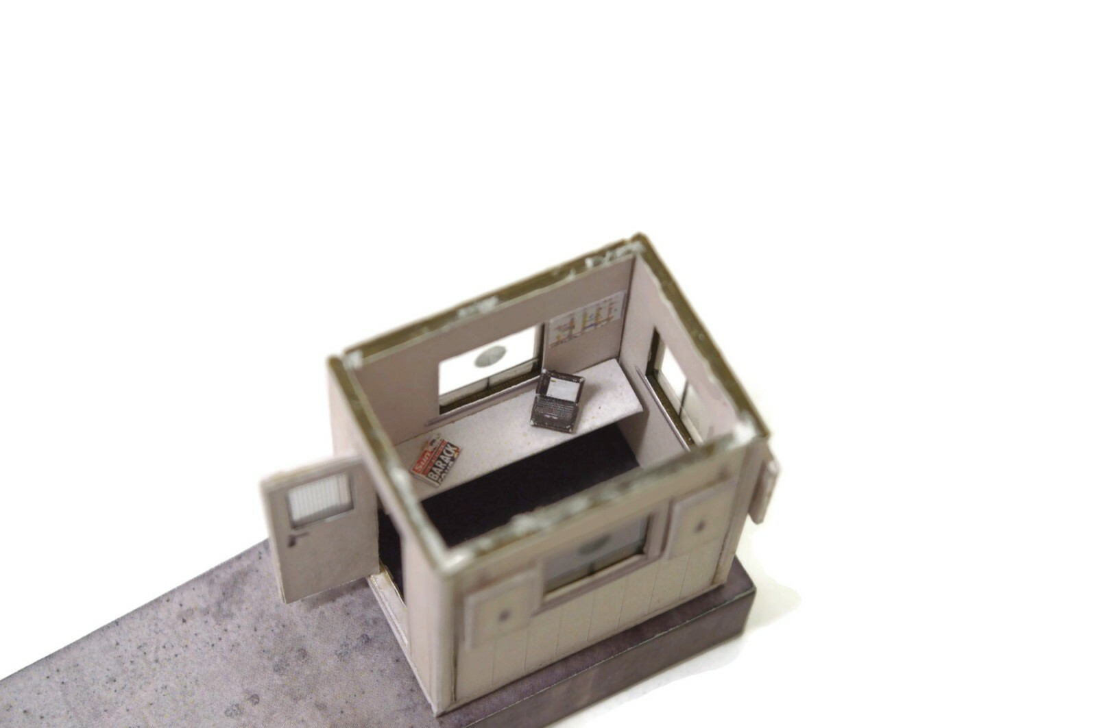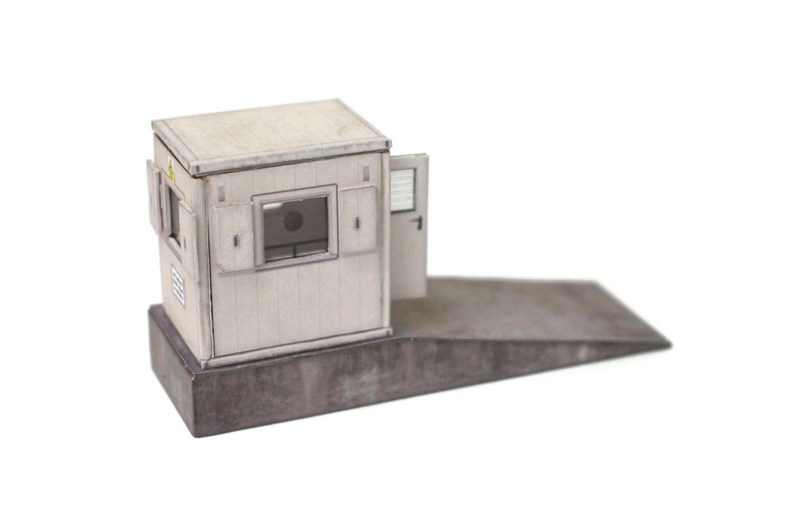 A highly detailed, versatile Security Hut / Gatehouse kit for the OO scale / 1:76 modeller, with laser cut card base layers making the kit very straightforward to assemble. Ideal for use as a small security hut at the entrance to a distribution depot, freight yard, warehouse or factory, even a small site office on a building site or weighbridge office. Plus there's plenty of scope for kit-bashing too. The kit comes with pre-weathered finishes and full interior detail including laptop, newspapers, posters & notices as well as wall, ceiling and floor finishes. There's even a wall mounted heater to keep the chaps on duty warm! Also included is an optional concrete ramp / plinth for the building to sit on which brings the windows up to lorry drivers height.