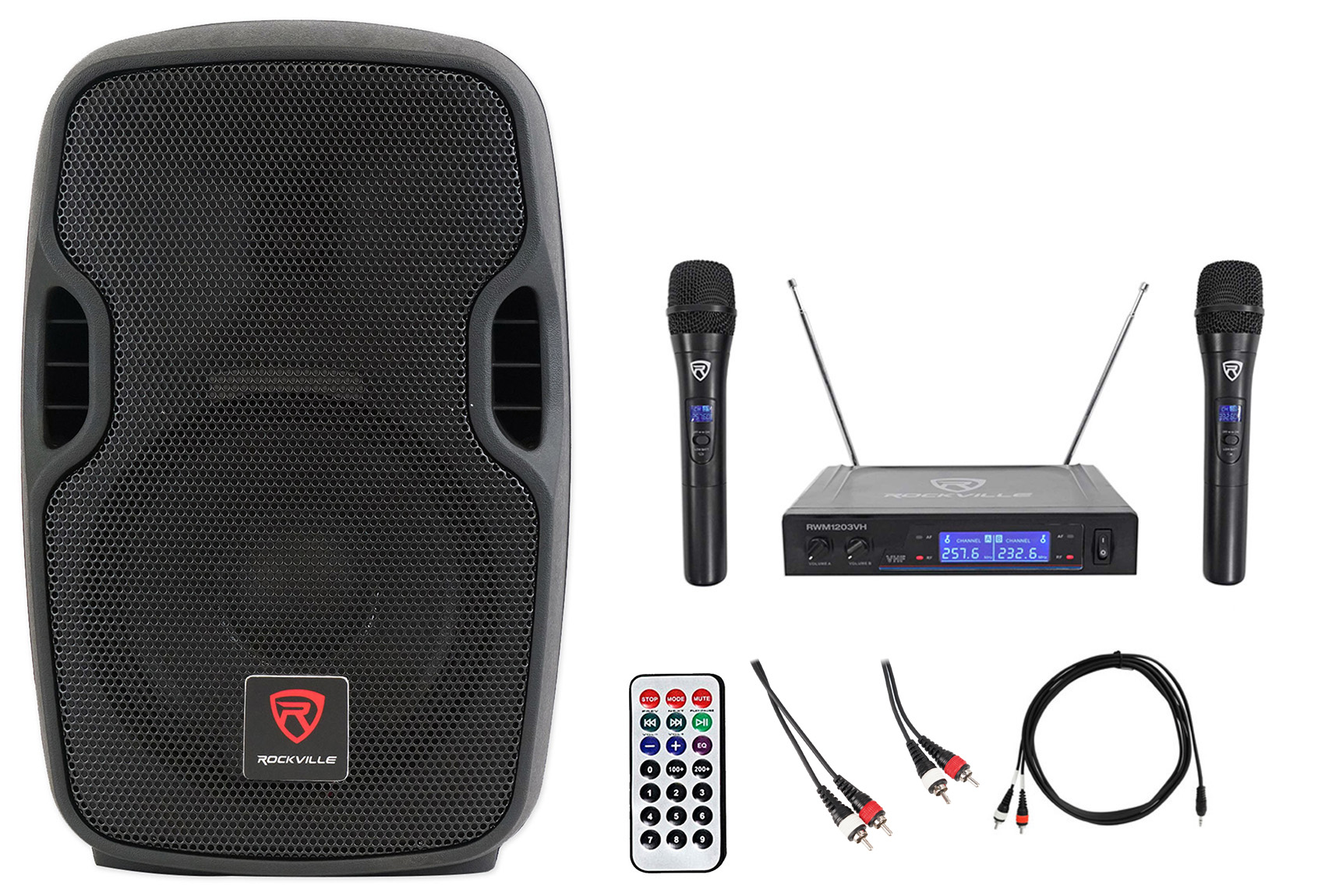 Package: Rockville BPA8 8" Active DJ/PA Speaker Totaling 300 Watt With Built In Bluetooth, Remote + Rockville RWM1203VH VHF Wireless Dual HandHeld Microphone System/Digital Display + Rockville RCDR10B 10' Nickel-Plated Dual RCA to Dual RCA Cable - 100 % Copper Top Quality Cable!