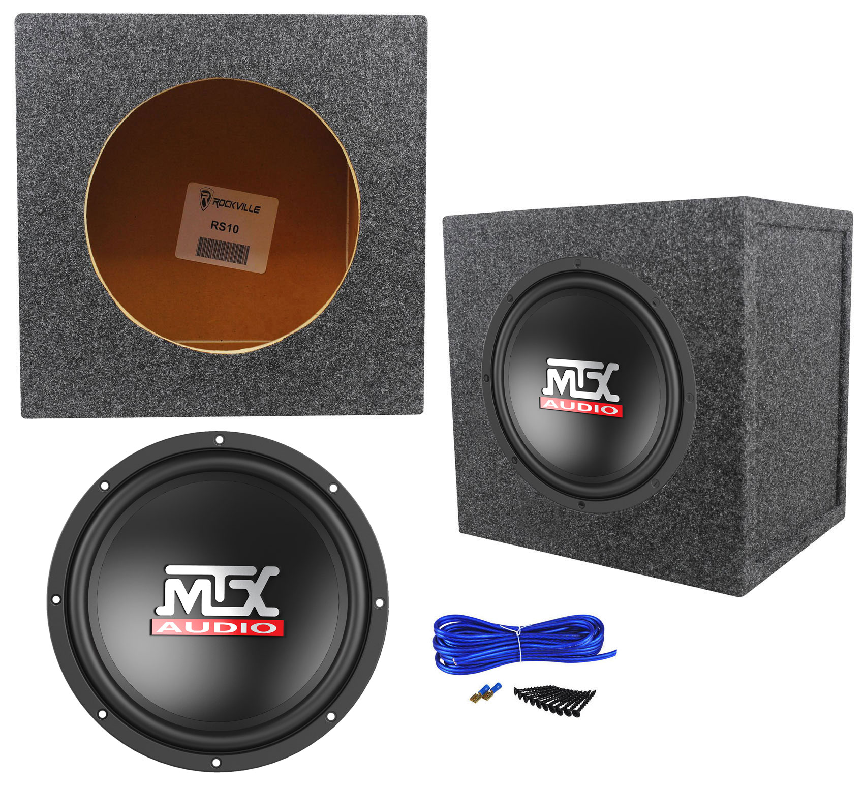 Package: MTX Terminator TN10-04 10” 300 Watts Peak / 150 Watts 4 Ohm Car Audio Subwoofer with Polypropylene Cone and Rubber Surround + Rockville RS10 Single 10” 0.75 cu.ft. Sealed Subwoofer Enclosure With Grade A 3/4" MDF, Made in America Using Only the Highest Quality Materials for the Best Performance and Sound From Your Subs + COMPLETE SINGLE ENCLOSURE INSTALLATION KIT WITH 14 AWG SPEAKER WIRE + DRYWOOD SCREWS + SPADE TERMINALS