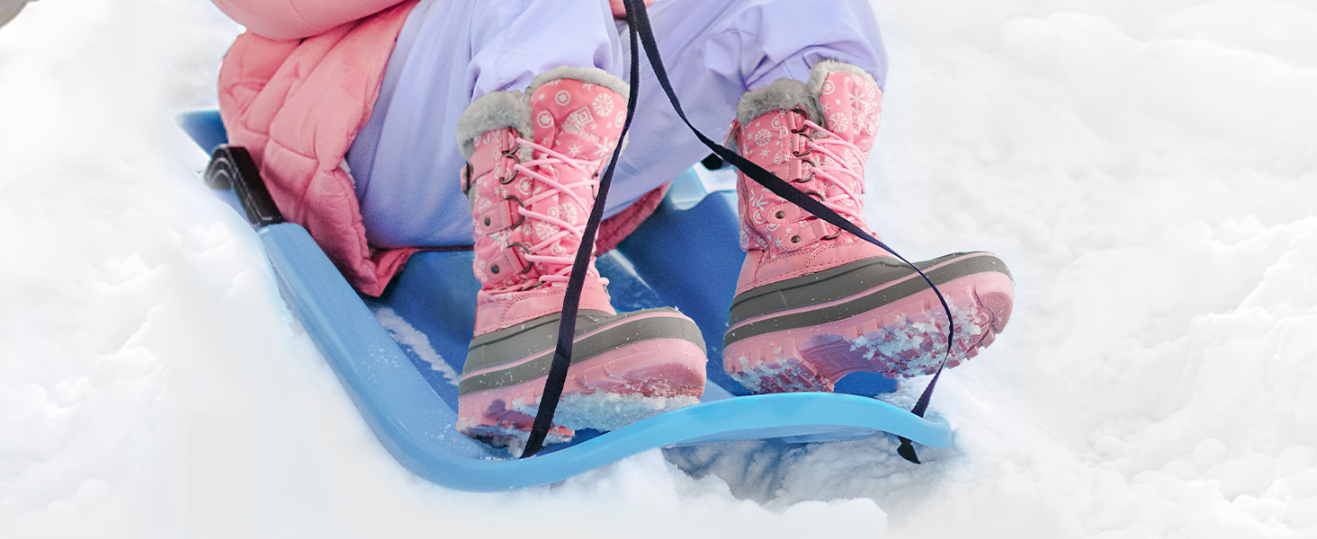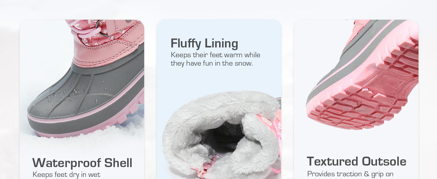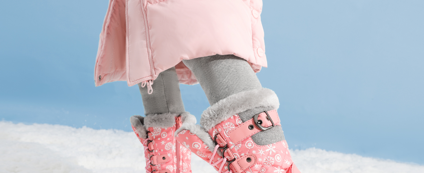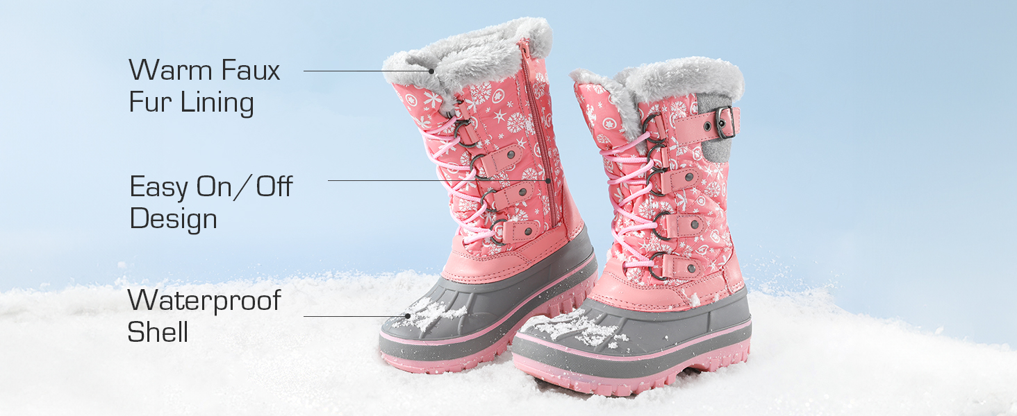 • Water-Resistant Design : Made with a lace-up closure, stylish D-rings, adjustable buckle strap and soft faux fur collar. These kids’ snow boots have a 9-inch boot shaft that helps defend against cold and wind effectively