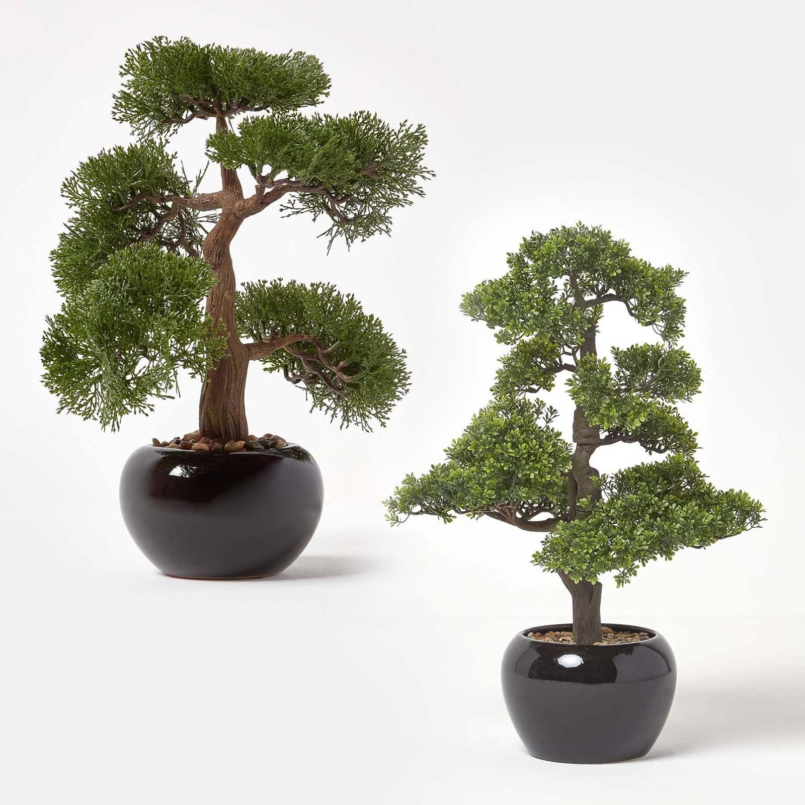Create a zen atmosphere in your bedroom or office with Homescapes' faux bonsai tree. Adding oriental style to your interiors, this artificial bonsai tree is potted inside a decorative ceramic black pot, which has a glossy look to add style to your home décor. Complete with faux soil and pebbles for a truly realistic look, this bonsai tree has been carefully handcrafted to ensure that it looks realistic and just as good as the real thing. Homescapes is a leading retailer of realistic and lifelike artificial plants with many more plants to choose from including a larger bonsai tree. Keep out of direct sunlight and wipe away dust with a soft cloth. Pack includes one bonsai tree.